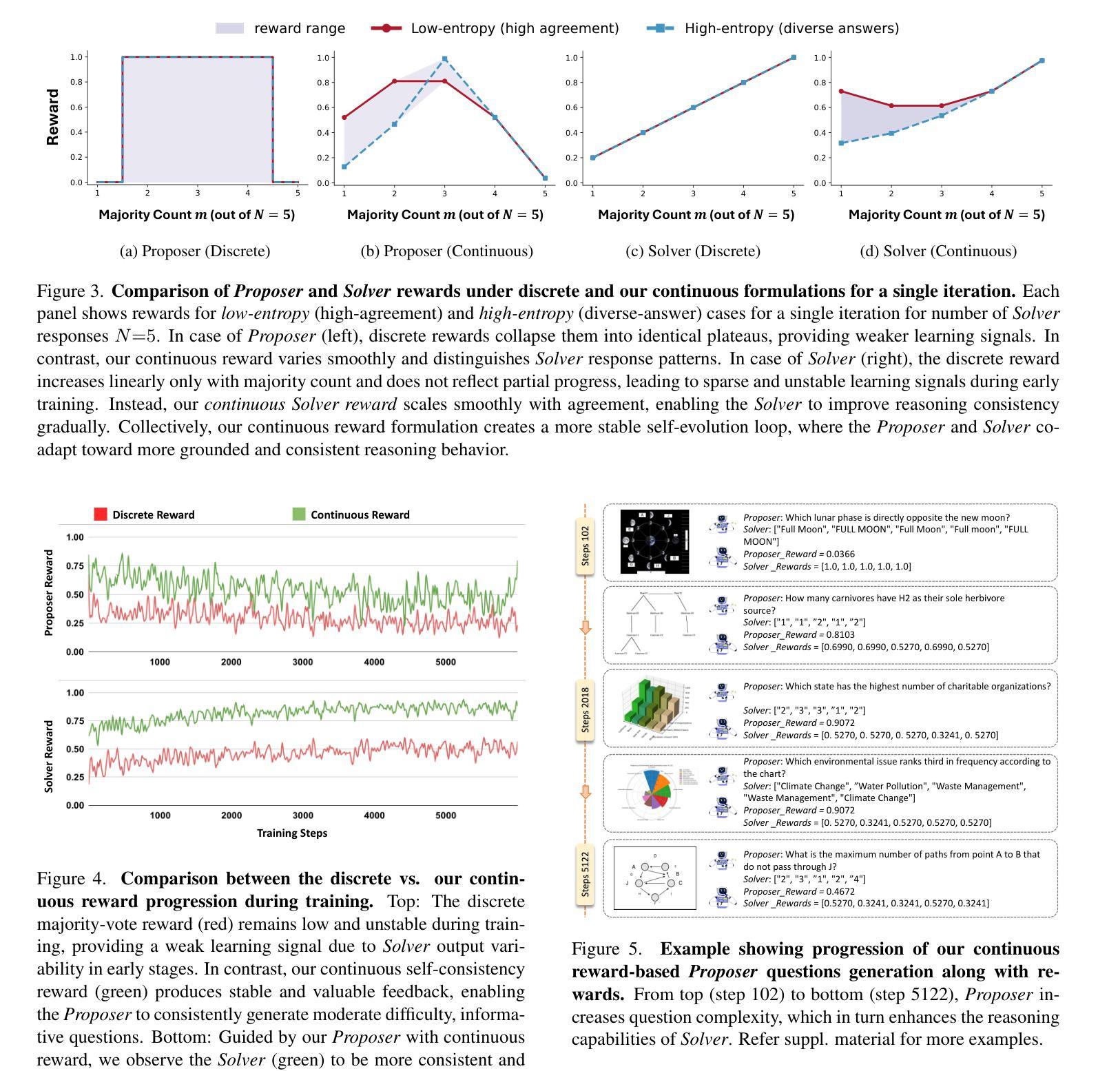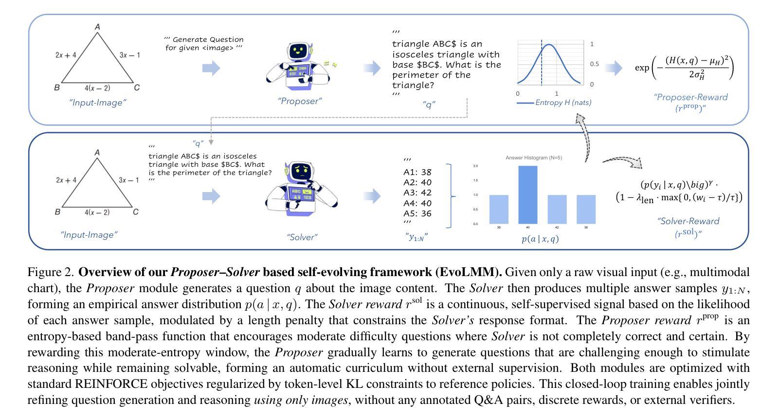 - EvoLMM框架由两个合作代理组成:提案者生成多样化、图像为基础的问题,求解器通过内部一致性解决这些问题。