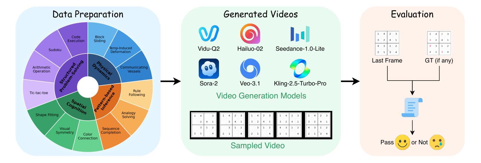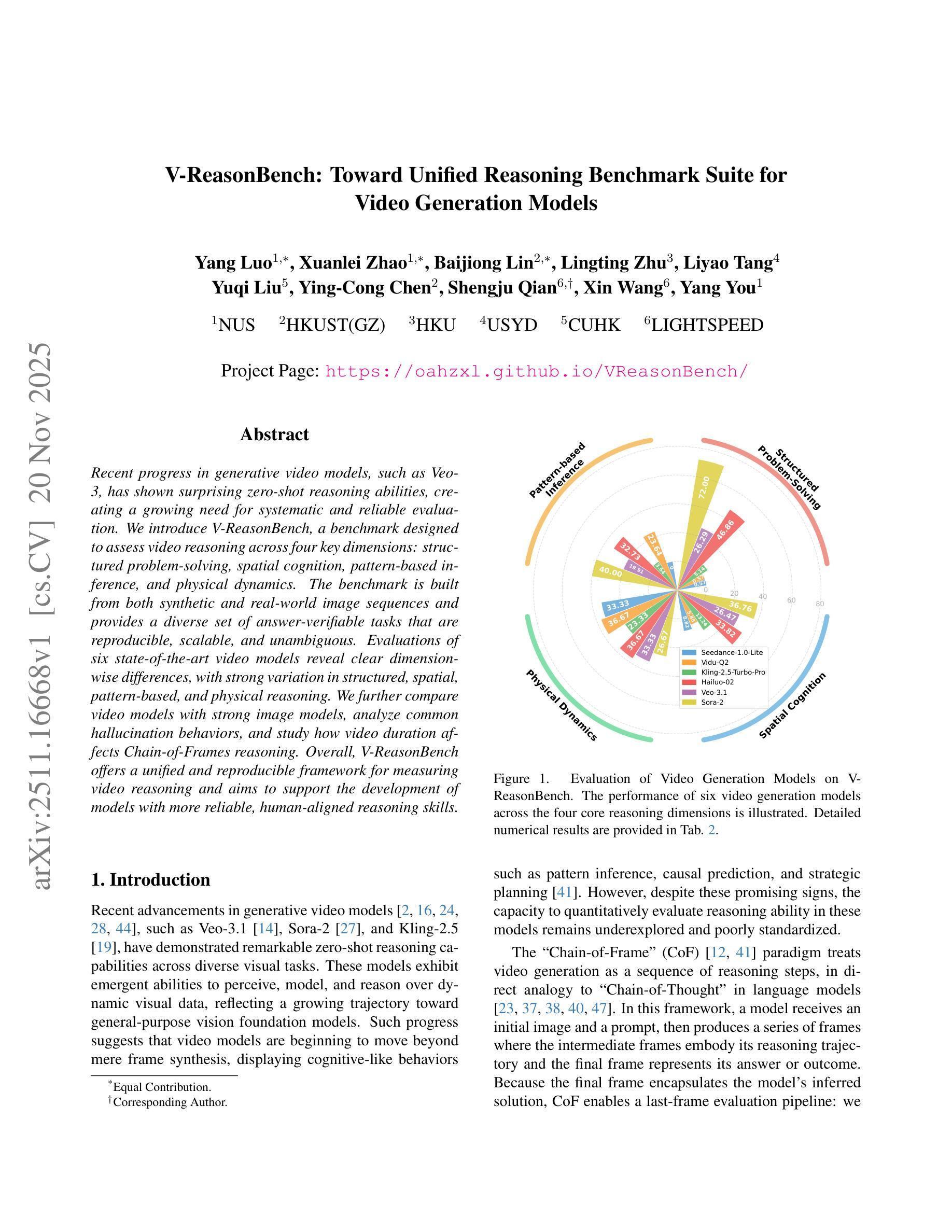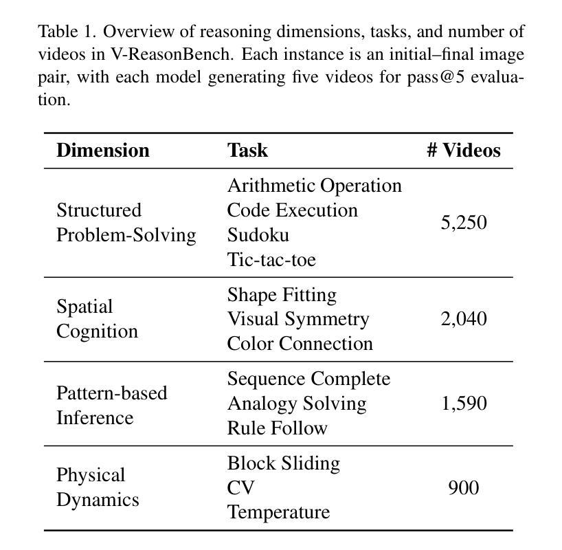 - V-ReasonBench是一个用于评估视频推理的基准测试,包括结构化问题解决、空间认知、模式推理和物理动态四个关键维度。