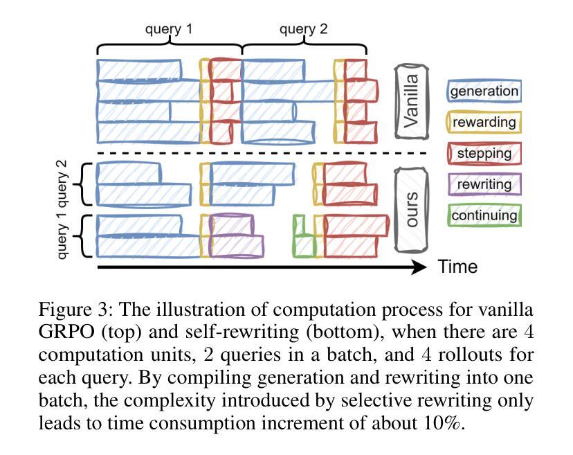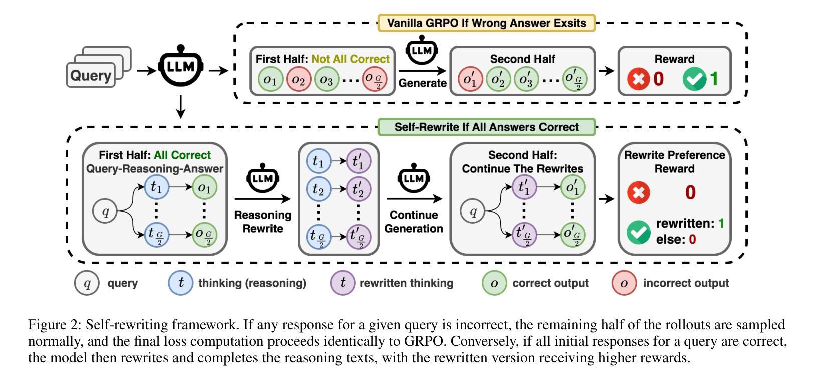 通过利用结果正确性奖励进行强化学习(RL),具有规模化推理计算的大型推理模型(LRM)在复杂的推理任务上取得了显著的成功。然而,仅侧重于最终正确性的单向奖励,限制了其对内部推理过程提供详细监督的能力。这一缺陷导致了内部推理质量不佳,表现为过度思考、思考不足、冗余思考和思维混乱等问题。受到LRM自我奖励领域的最新进展的启发,我们引入了自我重写框架,该框架让模型重写自己的推理文本,并从重写的推理中学习,以改善内部思维过程的质量。在算法设计方面,我们提出了一种选择性重写的方法,其中只有模型一致认为是“简单”的样本才会被重写,从而保留GRPO的所有原始奖励信号。在实际应用中,我们将重写和原生的文本生成放在同一批次内处理,这既保持了强化学习算法的可扩展性,只引入了约10%的开销。在多样化的任务上进行的大量实验验证了不同模型大小的自我重写框架的有效性。在准确性与长度之间的权衡方面,自我重写方法在不需要重写提示明确指示减少推理长度的情况下实现了更高的准确性(+0.6%)和更短的推理时间(-46%),超越了现有的强大基线。在内部推理质量方面,自我重写在LLM作为评估标准的指标上取得了更高的分数(+7.2),成功缓解了内部推理缺陷。