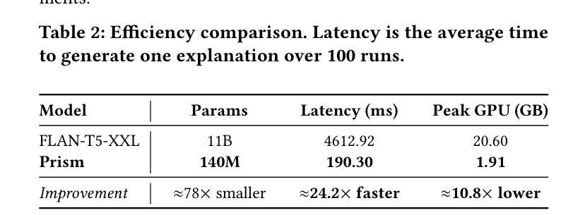 将大型语言模型(LLM)融入可解释推荐系统,在端到端架构中常常会导致性能效率的权衡,排名和解释的联合优化可能会导致次优妥协。为解决这一问题,我们提出了Prism,这是一种新型解耦框架,它将推荐过程严格分为专门的排名阶段和解释生成阶段。受知识蒸馏的启发,Prism利用强大的教师LLM(例如FLAN-T5-XXL)作为Oracle产生高保真解释知识。然后,一个经过微调的小型学生模型(例如BART-Base),即Prism,专门负责将这些知识合成个性化的解释。这种分解确保每个组件都针对其特定目标进行优化,消除了耦合模型中的固有冲突。在基准数据集上的大量实验表明,我们参数为1.4亿的Prism模型在人类对忠诚度和个性化的评估中显著优于参数为11亿的教师模型,同时在推理过程中实现了24倍的速度提升和10倍的内存消耗减少。这些结果验证了通过有针对性的蒸馏进行解耦,是通往高质量可解释推荐的高效有效路径。
