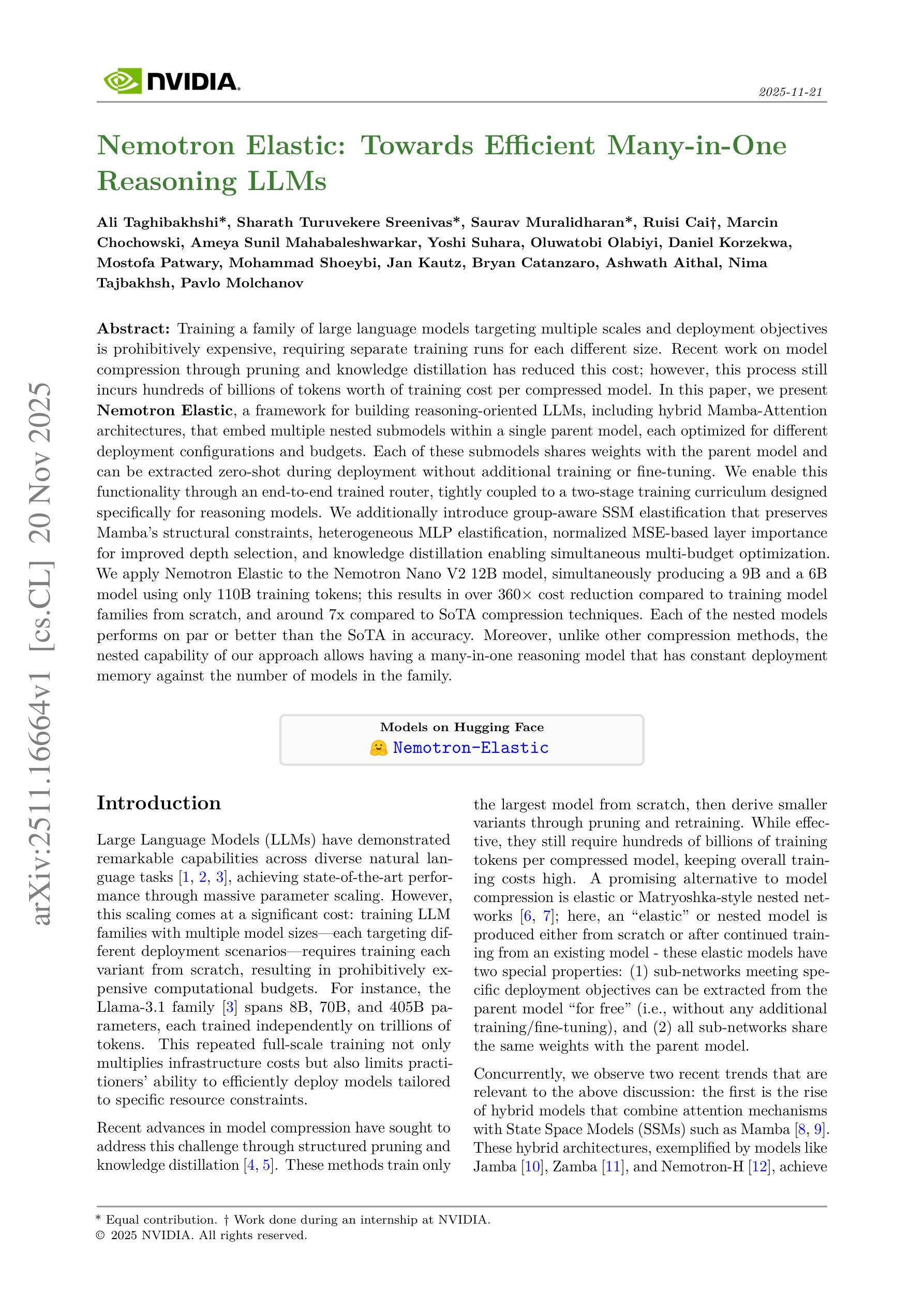 Training a family of large language models targeting multiple scales and deployment objectives is prohibitively expensive, requiring separate training runs for each different size. Recent work on model compression through pruning and knowledge distillation has reduced this cost; however, this process still incurs hundreds of billions of tokens worth of training cost per compressed model. In this paper, we present Nemotron Elastic, a framework for building reasoning-oriented LLMs, including hybrid Mamba-Attention architectures, that embed multiple nested submodels within a single parent model, each optimized for different deployment configurations and budgets. Each of these submodels shares weights with the parent model and can be extracted zero-shot during deployment without additional training or fine-tuning. We enable this functionality through an end-to-end trained router, tightly coupled to a two-stage training curriculum designed specifically for reasoning models. We additionally introduce group-aware SSM elastification that preserves Mamba’s structural constraints, heterogeneous MLP elastification, normalized MSE-based layer importance for improved depth selection, and knowledge distillation enabling simultaneous multi-budget optimization. We apply Nemotron Elastic to the Nemotron Nano V2 12B model, simultaneously producing a 9B and a 6B model using only 110B training tokens; this results in over 360x cost reduction compared to training model families from scratch, and around 7x compared to SoTA compression techniques. Each of the nested models performs on par or better than the SoTA in accuracy. Moreover, unlike other compression methods, the nested capability of our approach allows having a many-in-one reasoning model that has constant deployment memory against the number of models in the family.