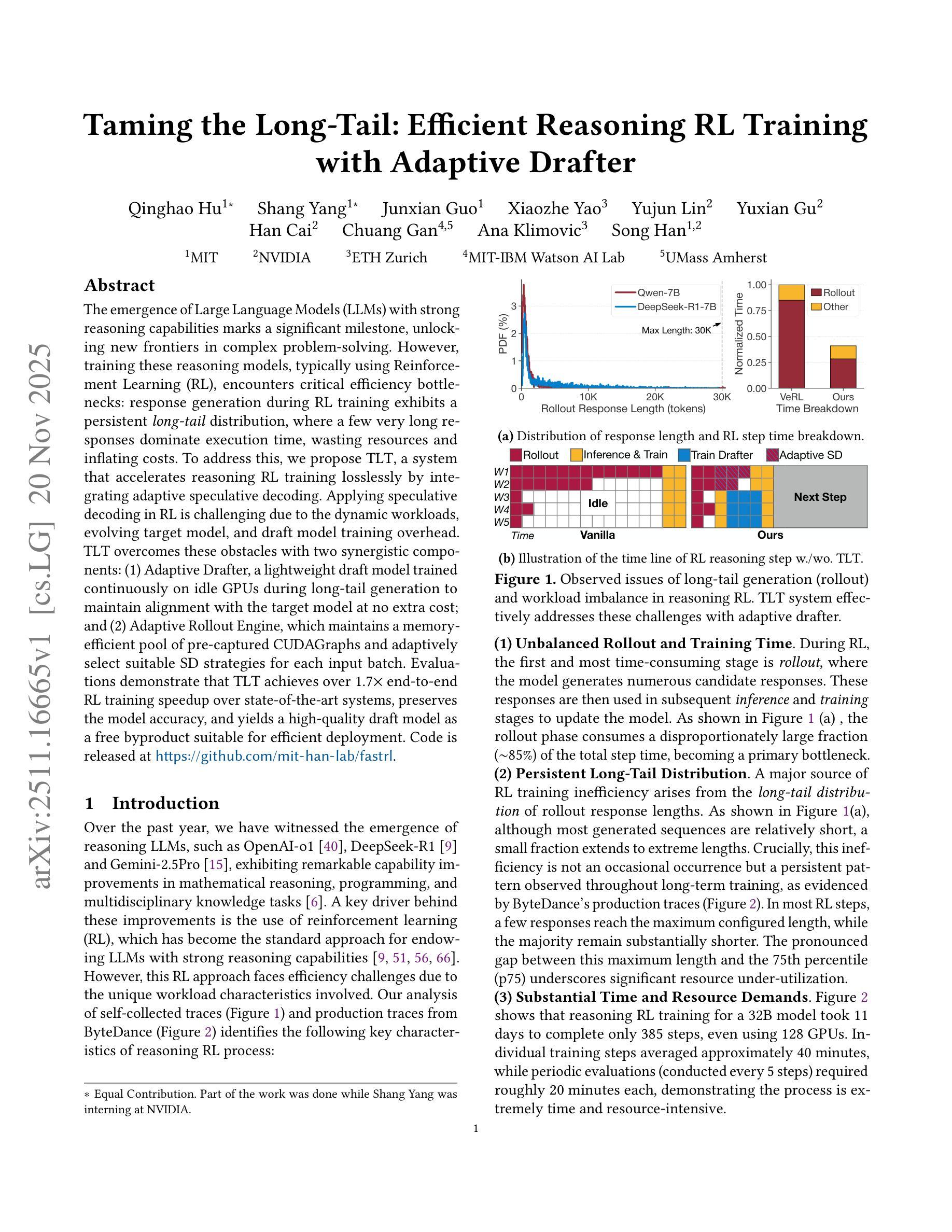 大型语言模型(LLM)的出现,具备强大的推理能力,为复杂问题解决开启了新纪元。然而,使用强化学习(RL)训练这些推理模型时,存在效率瓶颈。响应生成过程中存在长尾分布现象,少数超长响应占据大量执行时间,浪费资源、增加成本。为此,提出TLT系统,通过集成自适应推测解码,无损加速推理RL训练。TLT包括两个协同组件:自适应起草人和自适应回滚引擎。评估显示,TLT较现有系统实现超过1.7倍端到端RL训练加速,保持模型精度,并产生适合高效部署的高质量草案模型作为副产品。
