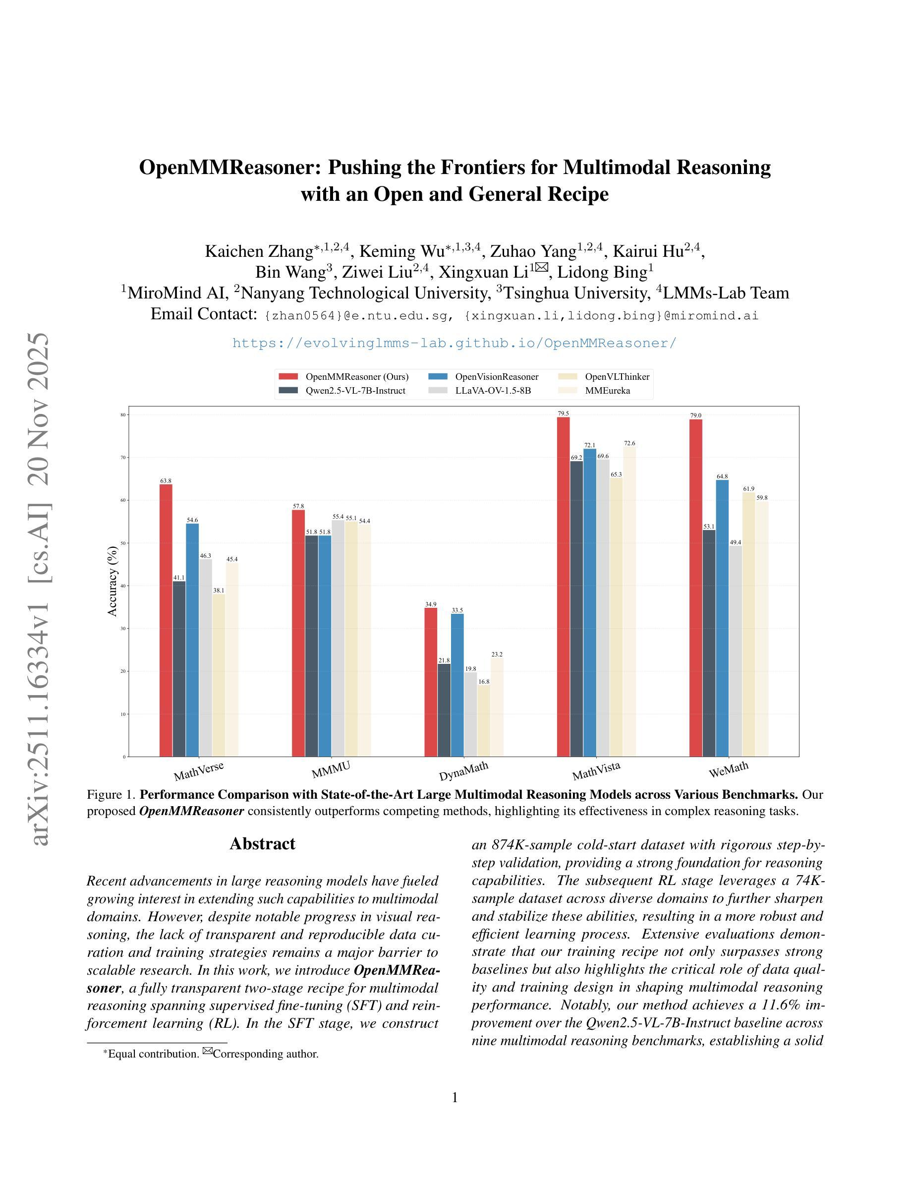 近期大型推理模型的进步激发了将此类能力扩展到多模式领域的兴趣。然而,尽管在视觉推理方面取得了显著的进展,但缺乏透明和可重复的数据策划和培训策略仍是阻碍规模化研究的主要障碍。在这项工作中,我们介绍了OpenMMReasoner,这是一个完全透明的两阶段多模式推理配方,涵盖监督微调(SFT)和强化学习(RL)。在SFT阶段,我们使用严格按步骤验证的方法构建了一个包含87万样本的冷启动数据集,为推理能力提供了坚实的基础。随后的RL阶段利用不同领域的74K样本数据集进一步磨练和稳定这些能力,从而形成一个更稳健和高效的学习过程。广泛评估表明,我们的训练配方不仅超越了强大的基准测试,而且还突出了数据质量和培训设计在塑造多模式推理性能中的关键作用。值得注意的是,我们的方法在九个多模式推理基准测试上较Qwen 2.5-VL-7B-Instruct基线提高了11.6%,为未来大规模多模式推理研究建立了坚实的实证基础。我们在https://github.com/EvolvingLMMs-Lab/OpenMMReasoner上公开了所有代码、管道和数据。