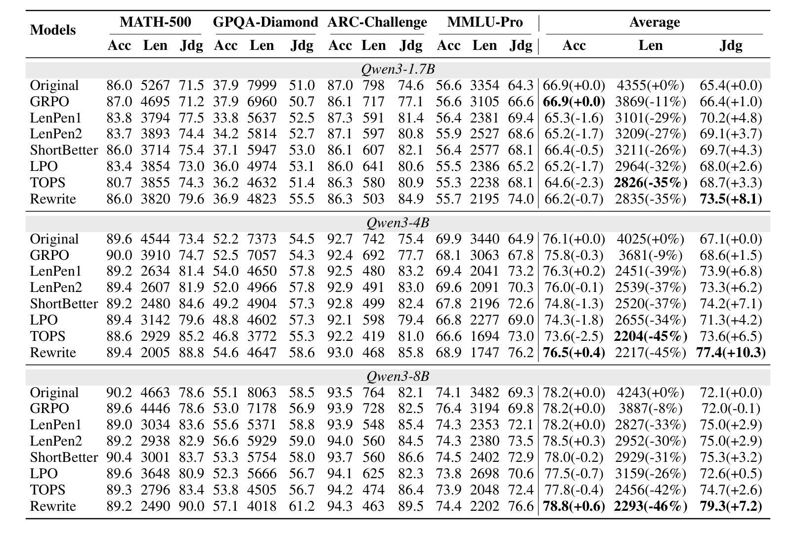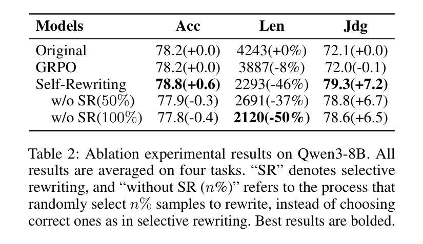 - 自我重写方法在准确性与长度之间取得平衡,实现更高的准确性和更短的推理时间。