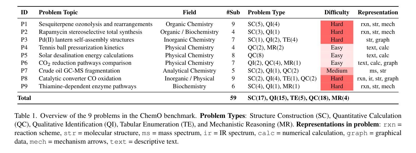 - ChemO基准测试采用国际化学奥林匹克竞赛数据,是化学领域中自动化评估的挑战之一。