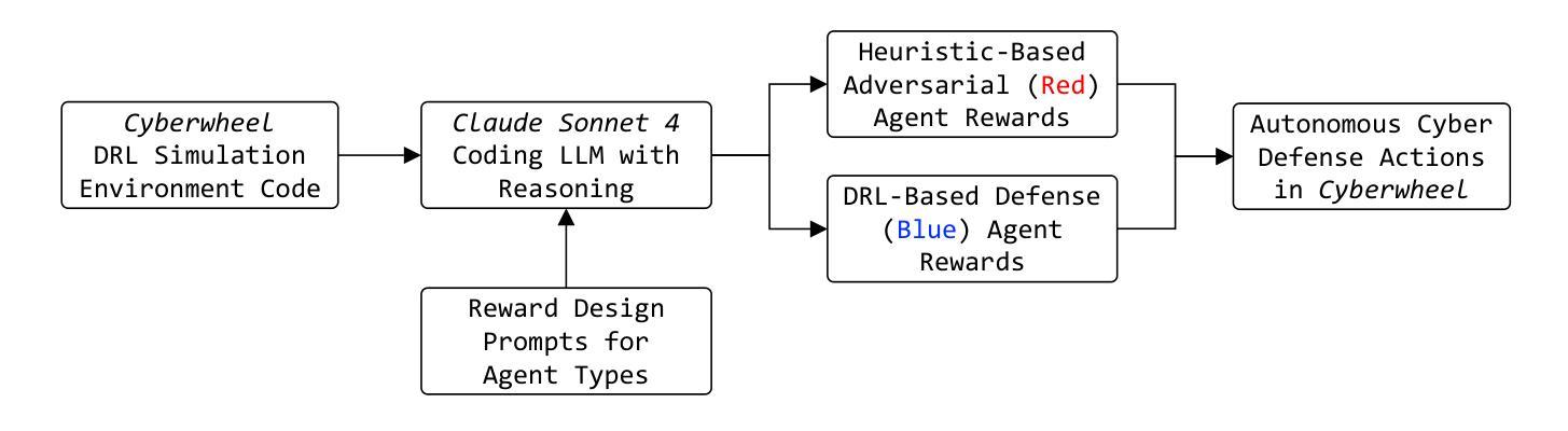 为复杂动态环境中的自主网络攻击和防御学习代理设计奖励是主题专家面临的一项具有挑战性的任务。我们提出了一种基于大型语言模型(LLM)的奖励设计方法,以在深度强化学习(DRL)驱动的仿真实验环境中生成自主网络防御策略。我们设计了多个攻击和防御代理角色,以反映代理行为的异质性,以生成由LLM引导的奖励设计,其中LLM首先被提供上下文网络仿真环境信息。然后,这些奖励结构被用于DRL驱动的攻防仿真环境中,以学习一系列网络防御策略。我们的结果表明,LLM引导的奖励设计可以有效防御各种对抗性行为。