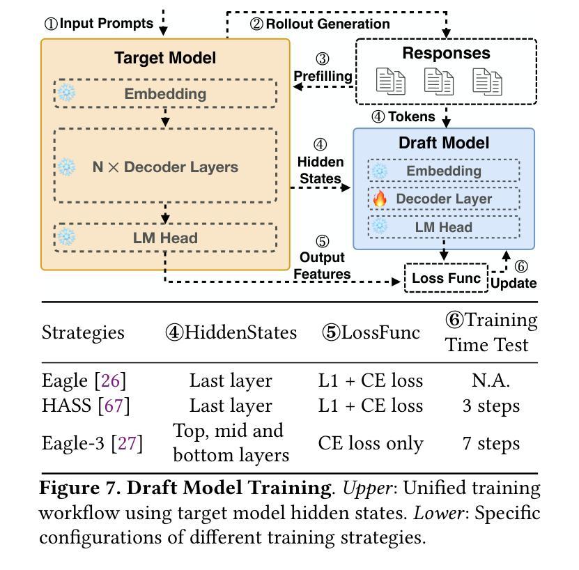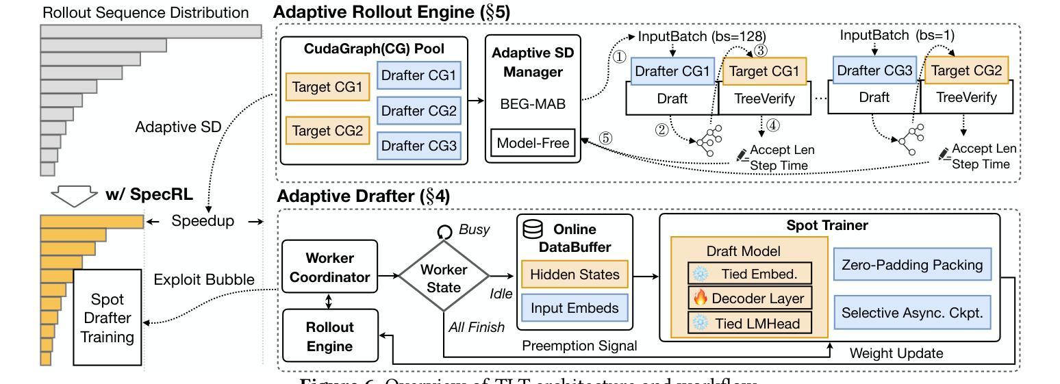 - TLT系统包括两个关键组件:自适应起草人和自适应回滚引擎,分别负责在空闲GPU上持续训练轻量级草案模型和维护预捕获的CUDAGraphs的内存效率池。