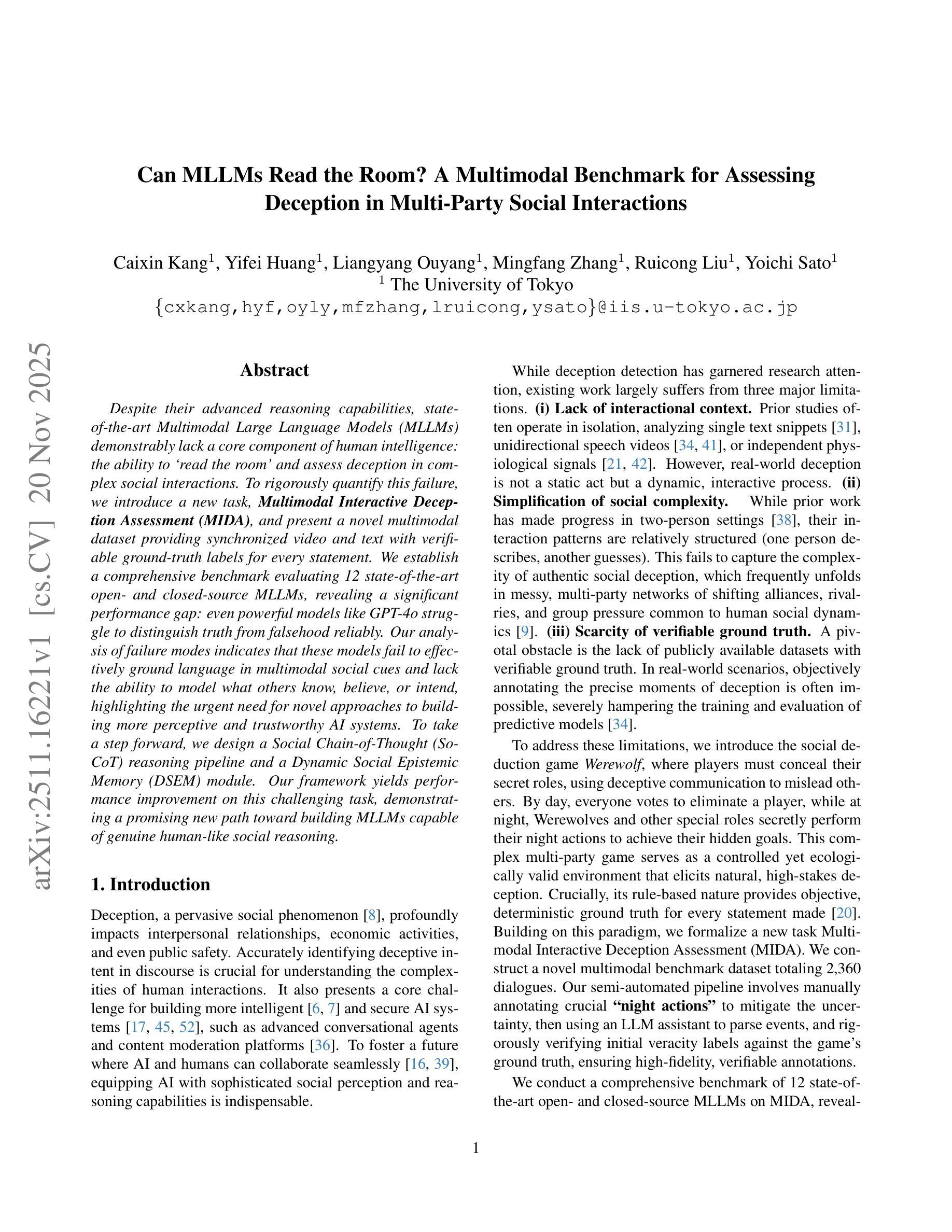 - 先进的多模态大型语言模型(MLLMs)缺乏“读懂房间”的能力,即在复杂社会互动中评估欺骗的核心人类智能。