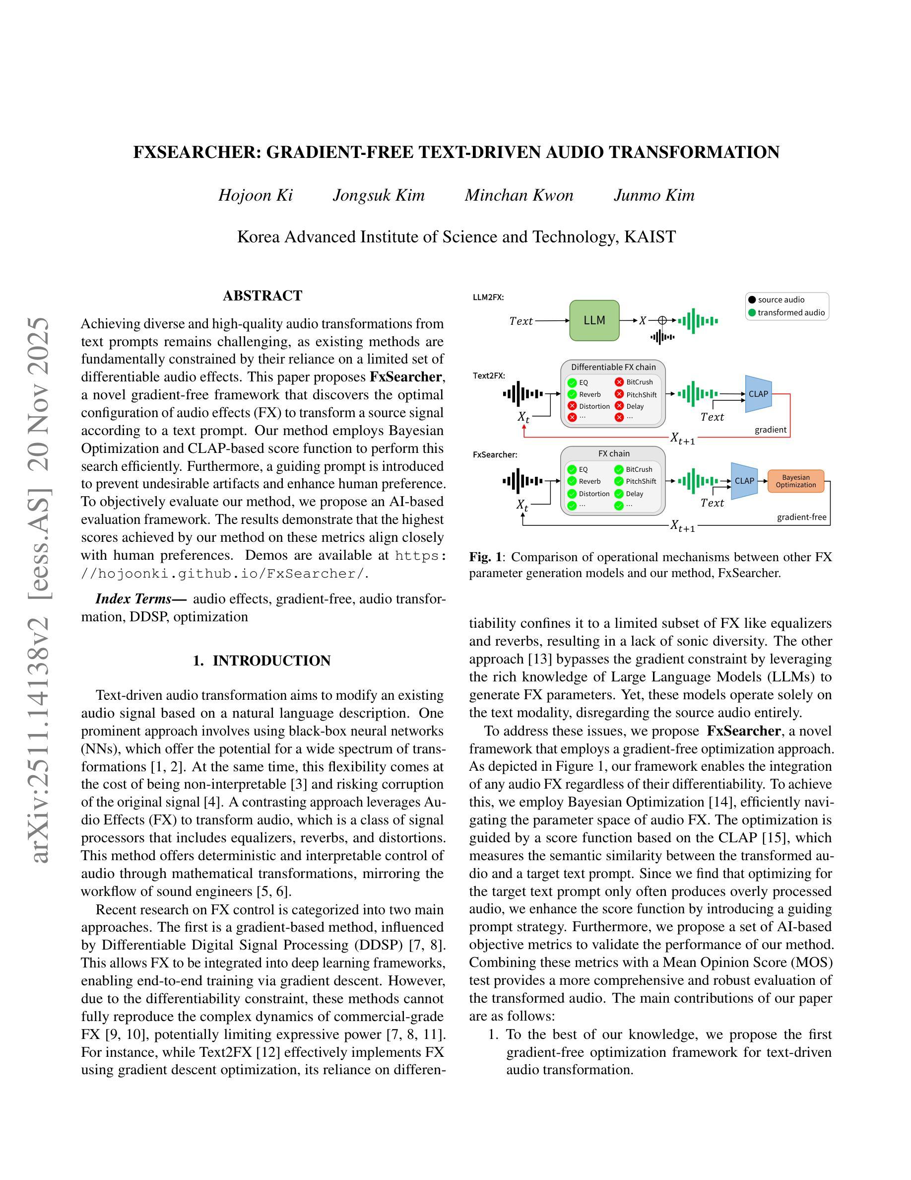 本论文提出一种无需梯度的框架FxSearcher,通过该框架能够发现最优的音频效果配置,以根据文本提示实现音频信号的转换。该方法采用贝叶斯优化和基于CLAP的评分函数进行高效搜索,并引入指导提示来防止不良伪影并增强人类偏好。此外,为了客观地评估该方法,论文还提出了一种基于AI的评估框架。实验结果表明,该方法在这些指标上获得的最高分数与人类偏好紧密对齐。