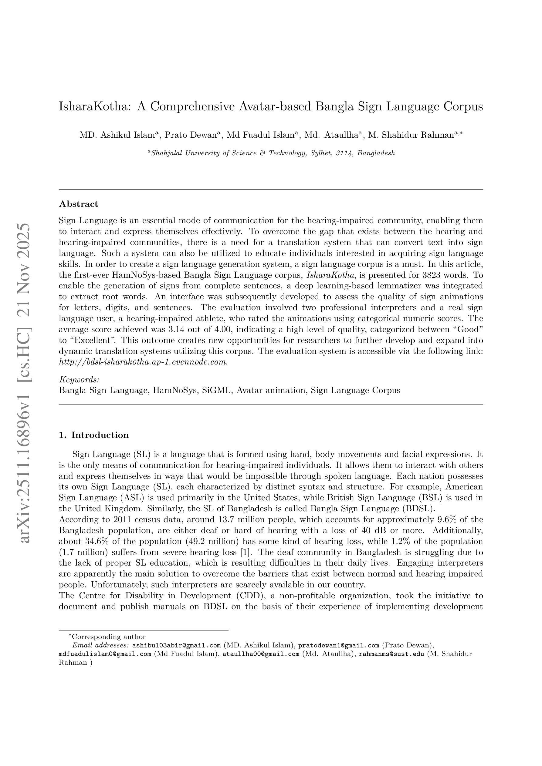 汉语言作为听力障碍者群体的重要沟通媒介,能够有效促进交流并展现自我。为弥补听力和听力障碍者之间的沟通障碍,文本转手势翻译系统至关重要。此系统也能支持想要学习手语技能的学习者。本次工作推出基于HamNoSys系统的孟加拉语手语语料库IsharaKotha,包含3823个单词。集成深度学习词法学规则提取工具以获取词根词汇,从而为完整句子生成手势。开发评估界面以评估字母、数字和句子的手势动画质量。两名专业翻译人员和一名实际手语使用者对动画进行评分,平均得分为3.14分(满分4分),表明系统表现良好至优秀水平。结果展示了IsharaKotha在手势语言翻译系统发展中的潜力。评估系统网址:http://bdsl-isharakotha.ap-1.evennode.com。