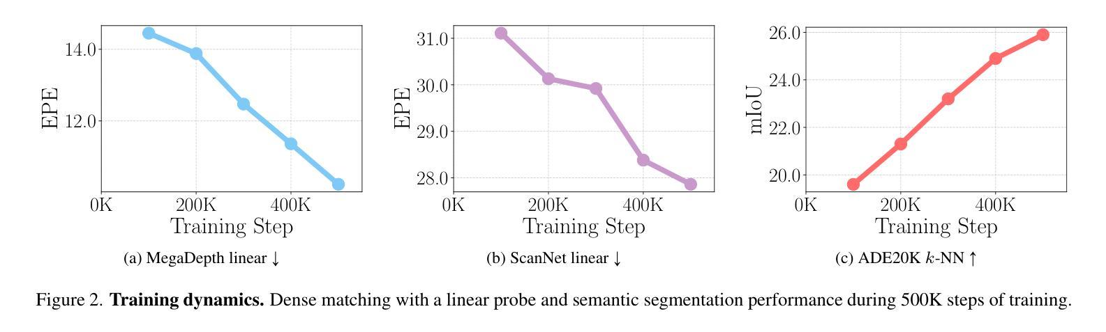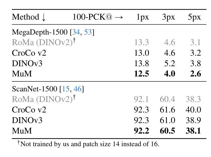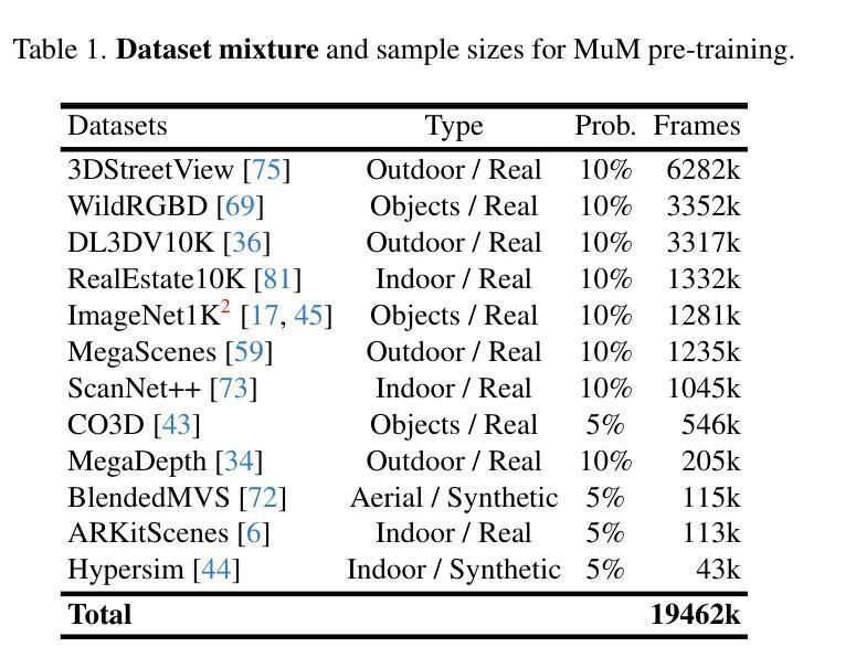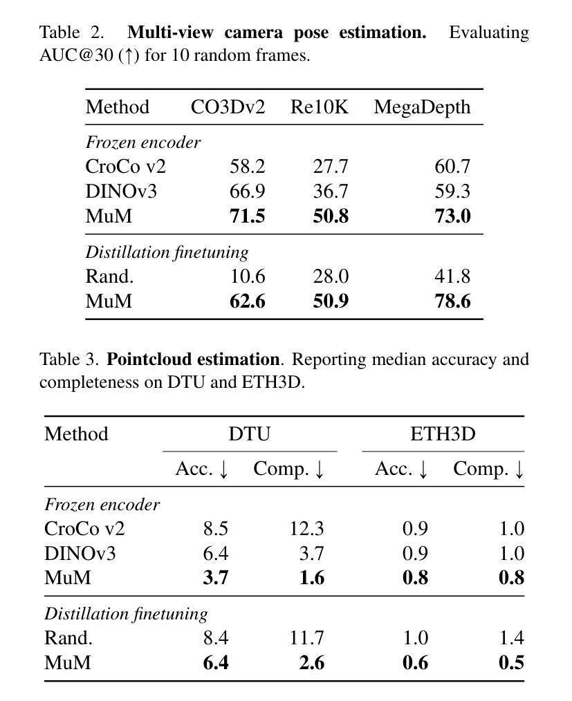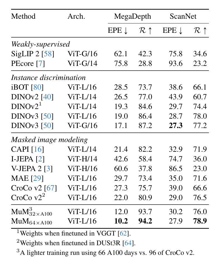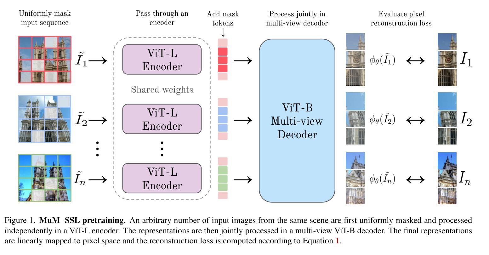 大型数据集上,自监督学习在图像领域提取有意义视觉表征,实现顶尖性能。DINOv3等模型广泛应用。但多数方法侧重于语义理解而非几何推理。本研究延续CroCo思路,专注于学习适用于3D视觉的特征。通过扩展MAE技术,实现同一场景的多视角学习。通过统一掩膜所有视角并使用轻量级解码器进行帧间注意力,方法更简单且更可扩展。在下游任务上评估MuM模型,包括前馈重建、密集图像匹配和相对姿态估计,超越现有视觉编码器DINOv3和CroCo v2。