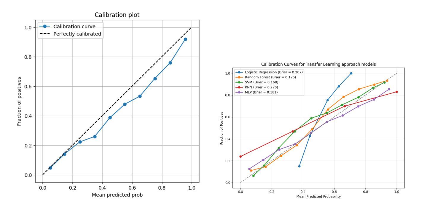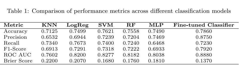 - 微调分类器性能最高,ROC-AUC达到0.888,具有良好的校准性能。
