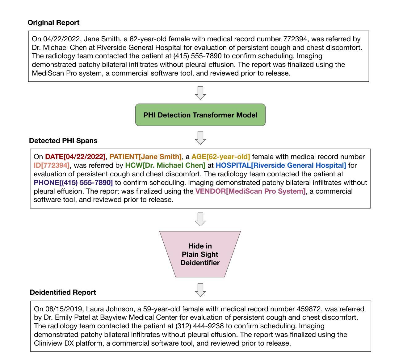 基于大规模多模态数据集训练的变压器模型在放射学报告自动去标识方面表现出优异性能,并在PHI检测方面建立了新的基准,超越了先前的学术和商用系统。