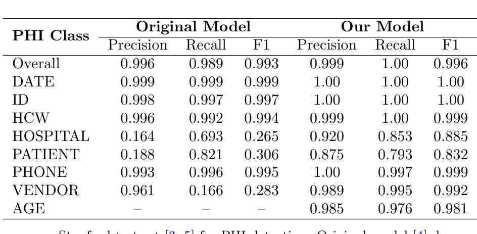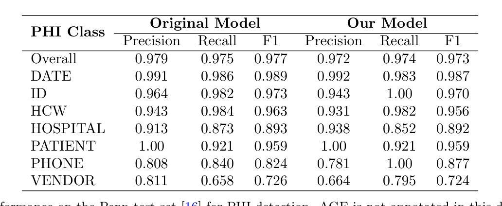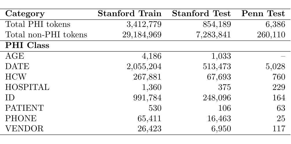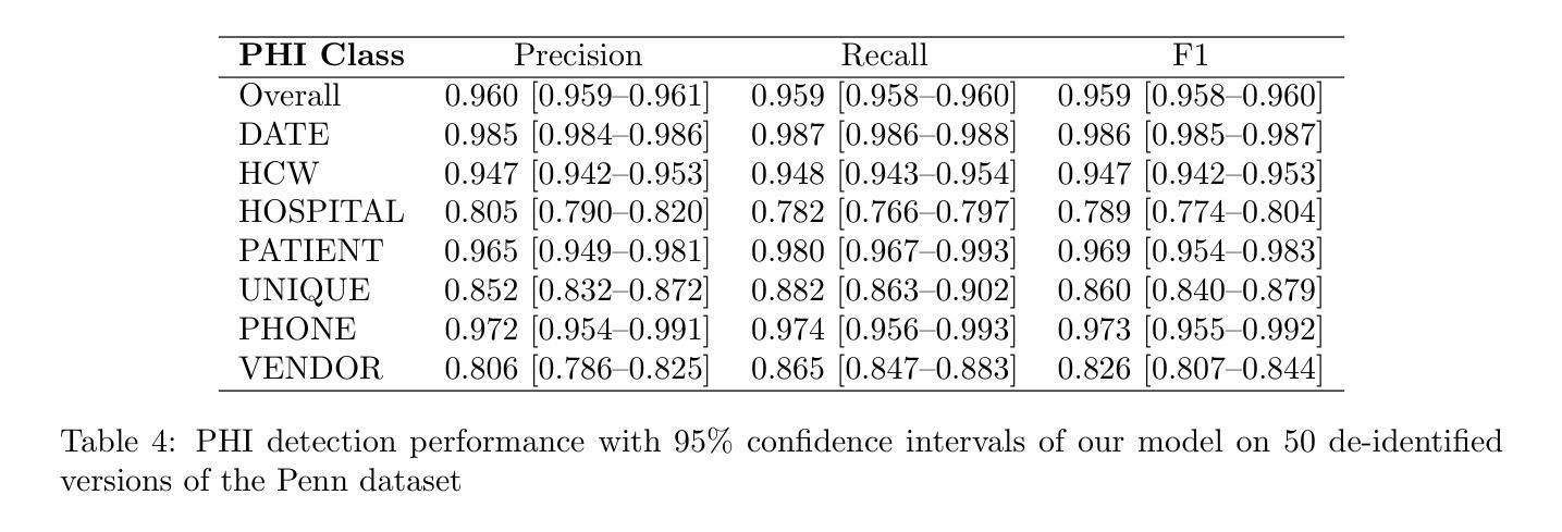 - 方法:基于斯坦福大学的两个大型注释放射学语料库(包含胸部X光、胸部CT、腹部/骨盆CT和大脑MR报告)对最先进的变压器PHI去标识管道进行了微调,并将新的PHI类别(年龄)纳入架构中。在斯坦福大学和宾夕法尼亚大学的测试集上评估了模型性能。同时评估了合成PHI生成的稳定性和商业系统的性能。