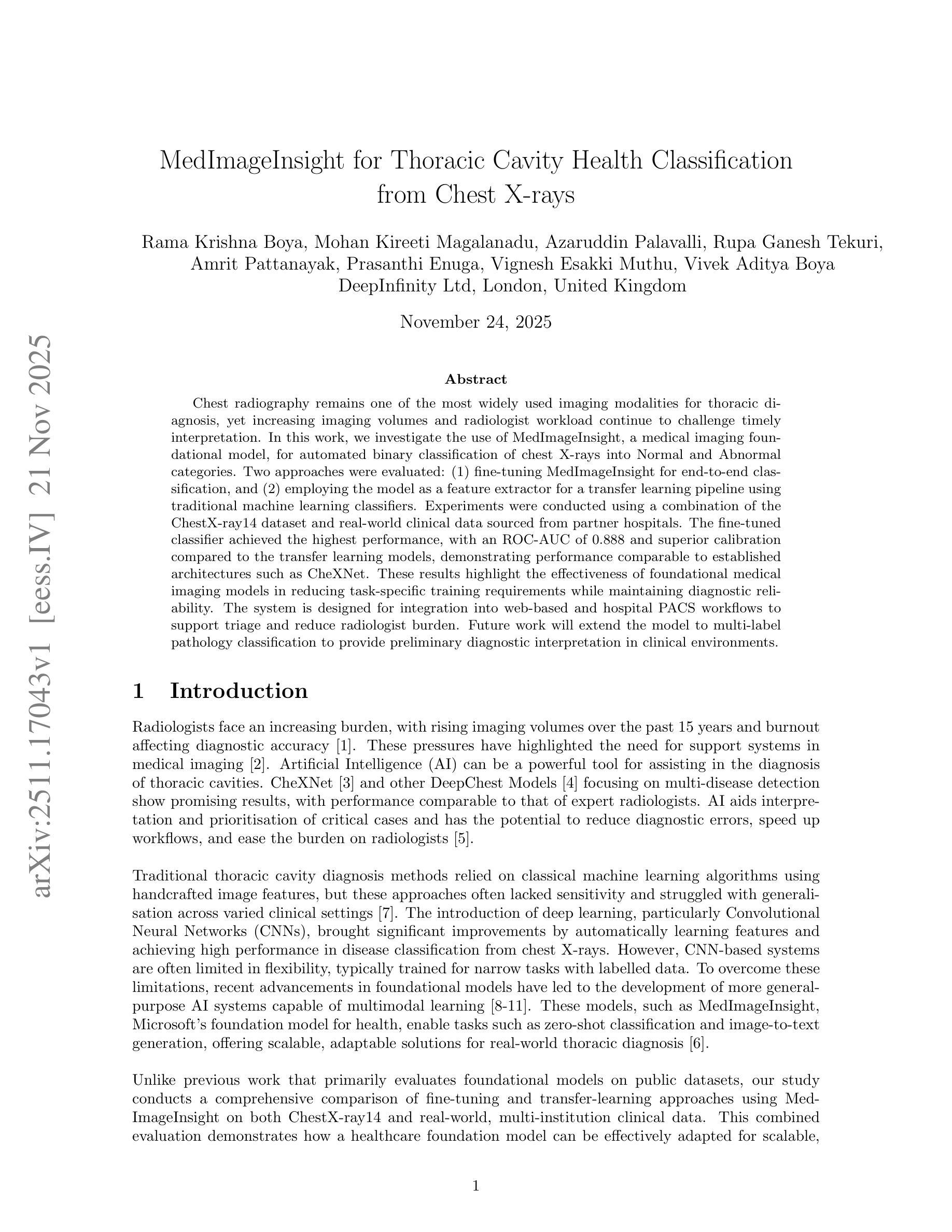 胸部放射学检查仍然是胸部诊断中最常用的成像方式之一,然而,日益增长的成像量和放射科医生的工作量继续对及时解读构成挑战。在这项工作中,我们研究了MedImageInsight这一医学成像基础模型在将胸部X射线自动二分类为正常和异常类别中的应用。我们评估了两种方案:(1)对MedImageInsight进行微调,以实现端到端的分类;(2)将该模型用作特征提取器,利用传统机器学习分类器构建迁移学习管道。实验结合了ChestX-ray14数据集和来自合作医院的真实世界临床数据。经过微调后的分类器性能最高,ROC-AUC达到0.888,并且与迁移学习模型相比具有更好的校准效果,显示出与CheXNet等已建立架构相当的性能。这些结果突出了基础医学成像模型在减少特定任务培训要求的同时保持诊断可靠性的有效性。该系统旨在集成到基于Web和医院PACS工作流程中,以支持初步筛选并减轻放射科医生的工作负担。未来的工作将扩展模型进行多标签病理分类,以在临床环境中提供初步诊断解读。