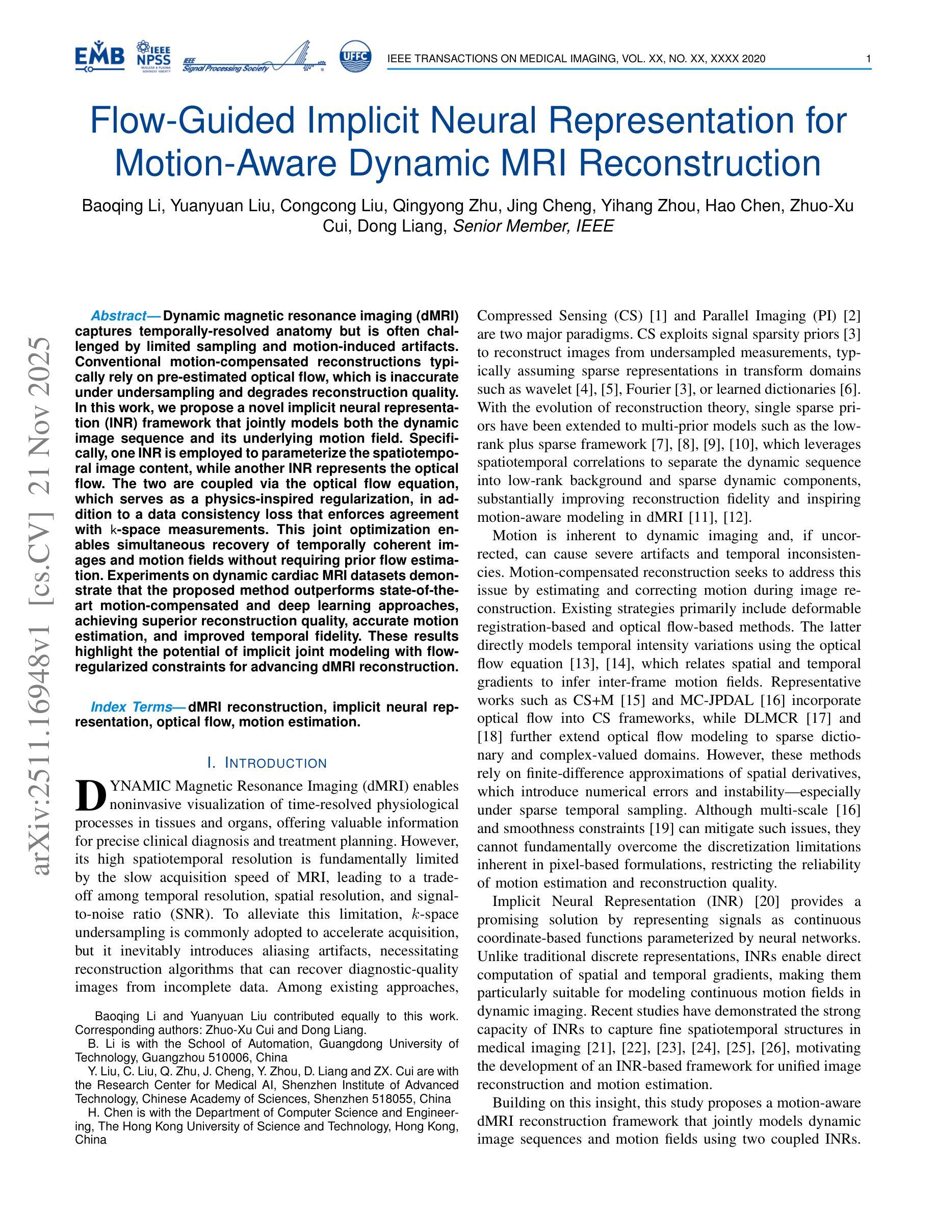 本文提出了一种基于隐神经表示(INR)框架的动态磁共振成像(dMRI)重建方法,该方法联合建模动态图像序列及其底层运动场。通过采用两个INR分别参数化时空图像内容和光流,并通过光流方程进行耦合,实现了无需预先估计光流的运动补偿重建。实验结果表明,该方法在动态心脏MRI数据集上的表现优于现有的运动补偿和深度学习方法,具有更高的重建质量、准确的运动估计和更好的时间保真度。