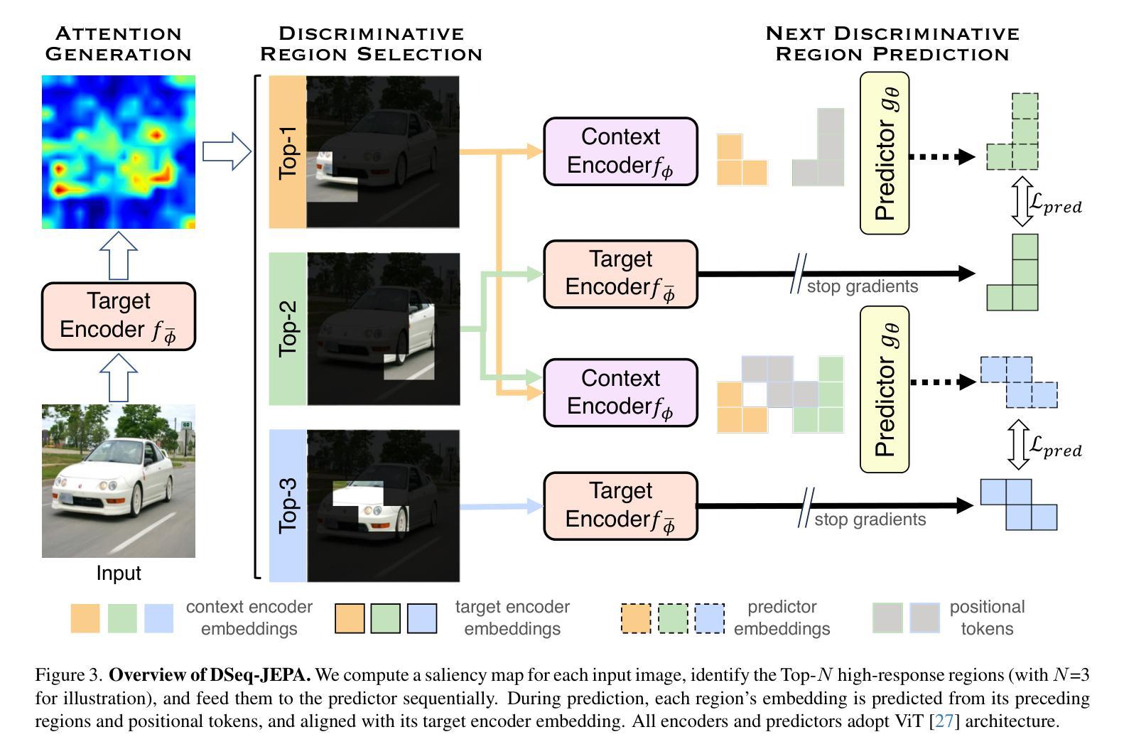 - DSeq-JEPA通过基于transformer的显著性地图识别主要鉴别区域,强调视觉重要性分布。