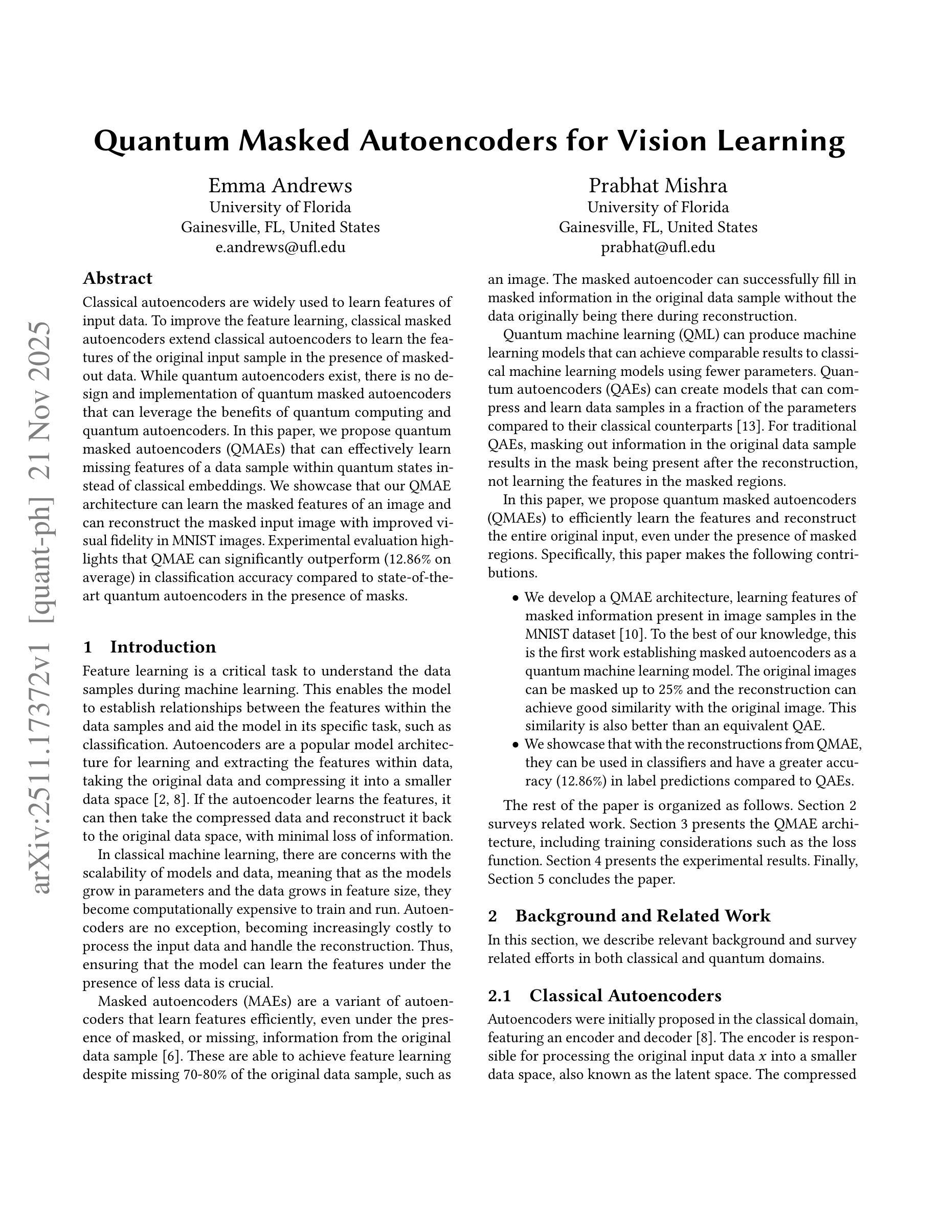 经典自编码器被广泛应用于学习输入数据的特征。为了提高特征学习,经典掩码自编码器扩展了经典自编码器,以在存在被掩盖的数据的情况下学习原始输入样本的特征。虽然存在量子自编码器,但并没有设计并实现可以利用量子计算和量子自编码器优势的量子掩码自编码器。在本文中,我们提出了量子掩码自编码器(QMAE),它可以在量子状态下有效地学习数据样本中缺失的特征,而不是使用经典嵌入。我们展示了我们的QMAE架构可以学习图像中的掩盖特征,并能够重建具有改进的视觉保真度的掩盖输入图像(如MNIST图像)。实验评估表明,在存在掩膜的情况下,QMAE在分类精度上平均高出12.86%,显著优于最新量子自编码器。