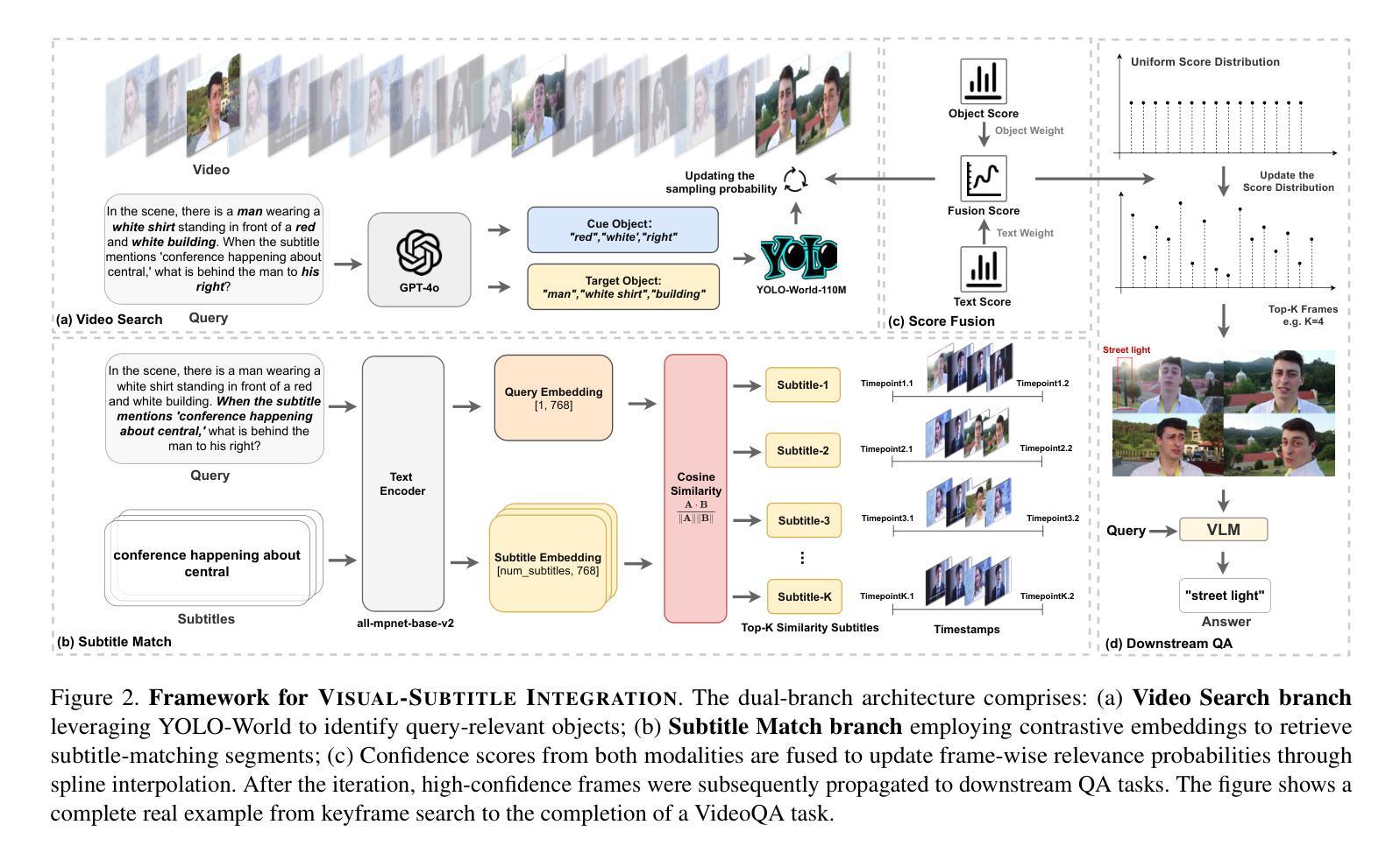 本文介绍了多模态大型语言模型在处理长视频时的挑战,包括输入上下文长度和计算成本的问题。为解决这些问题,提出了一种新的多模态关键帧检索框架——视觉字幕融合(VSI)。该框架采用双分支协同检索方法,结合视频搜索和字幕匹配,融合视觉和文本信息,实现精确的定位。实验结果表明,VSI在关键帧检索上达到了最先进的准确性,同时在文本相关任务上表现出卓越的性能,并具有较强的任务泛化能力。