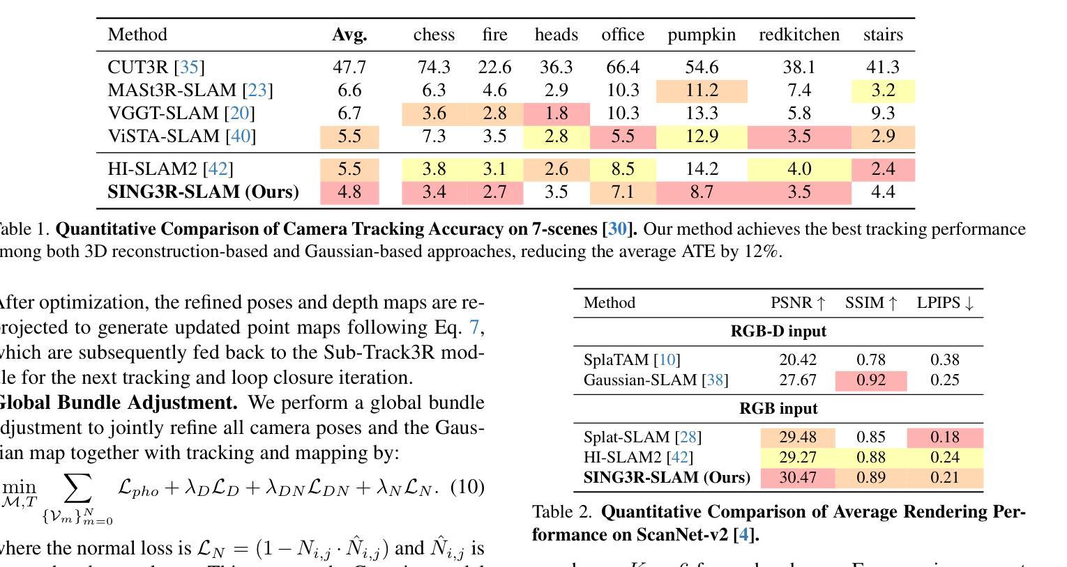- 实验证明SING3R-SLAM在跟踪、三维重建和新视图渲染方面表现优秀。