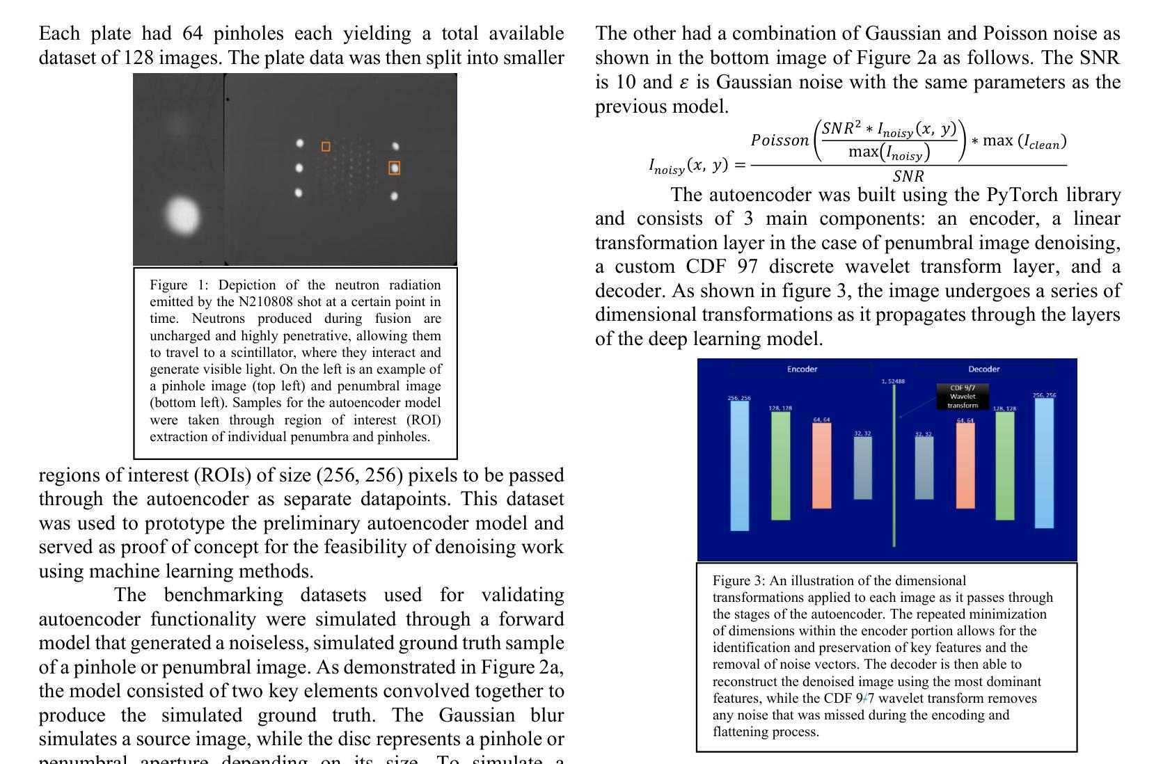中子成像对于优化惯性约束聚变(ICF)事件的分析,如国家点火设施(NIF)中的事件,以及改善当前和未来的ICF平台具有重要意义。然而,中子源图像通常受到各种噪声的干扰。最常见的是,高斯噪声和泊松噪声往往在同一图像中共存,掩盖了细节并模糊了边缘。这些噪声类型经常重叠,使用传统的过滤和阈值方法很难区分和去除。因此,能够保持图像保真度的降噪技术在分析的中子源图像中显得尤为重要。目前的解决方案包括过滤和阈值方法相结合的方法。过去由于缺乏用于ICF过程的中子成像的真实数据,机器学习的方法很少应用。然而,合成数据生产的最新进展,特别是融合成像领域的发展,已经提供了机会利用监督和无监督的机器学习方法来研究新的降噪程序的机会。在本研究中,我们在潜在空间中使用Cohen-Daubechies-Feauveau(CDF 97)小波变换实现了一种无监督的自编码器用于混合高斯泊松降噪。该网络成功地消除了中子成像数据中的噪声。此外,当它使用正向模型生成的数据进行基准测试时,与传统的非机器学习过滤机制(如块匹配和三维过滤(BM3D))相比,它在重建误差和边缘保留指标方面表现出更低的重建误差和更优越的性能。这种方法在中子图像降噪和ICF实验的三维重建分析中显示出有前途的进展。