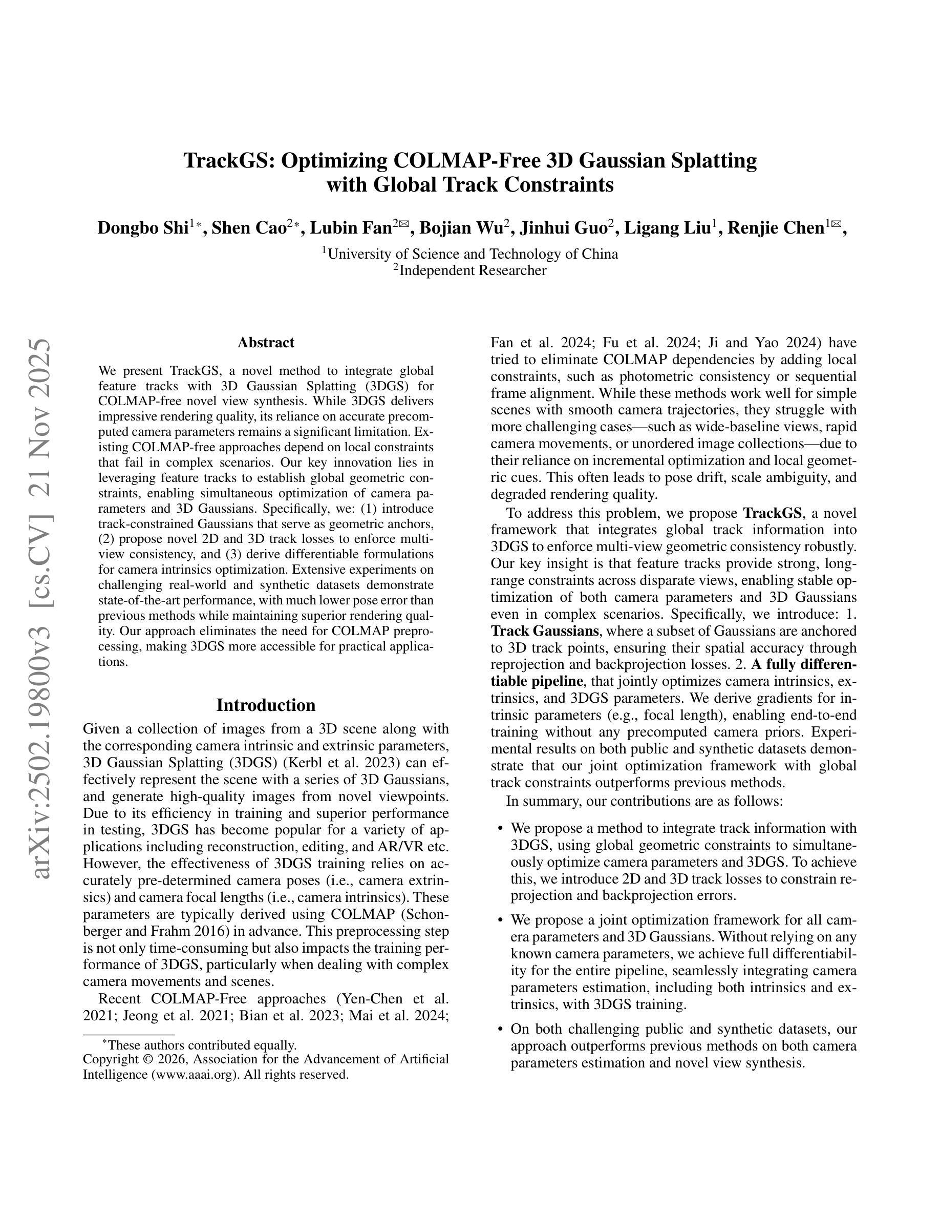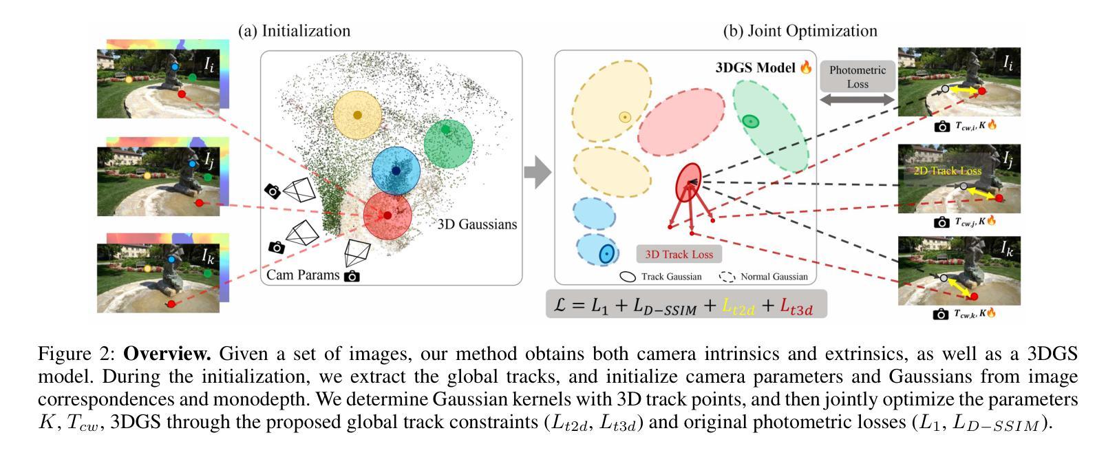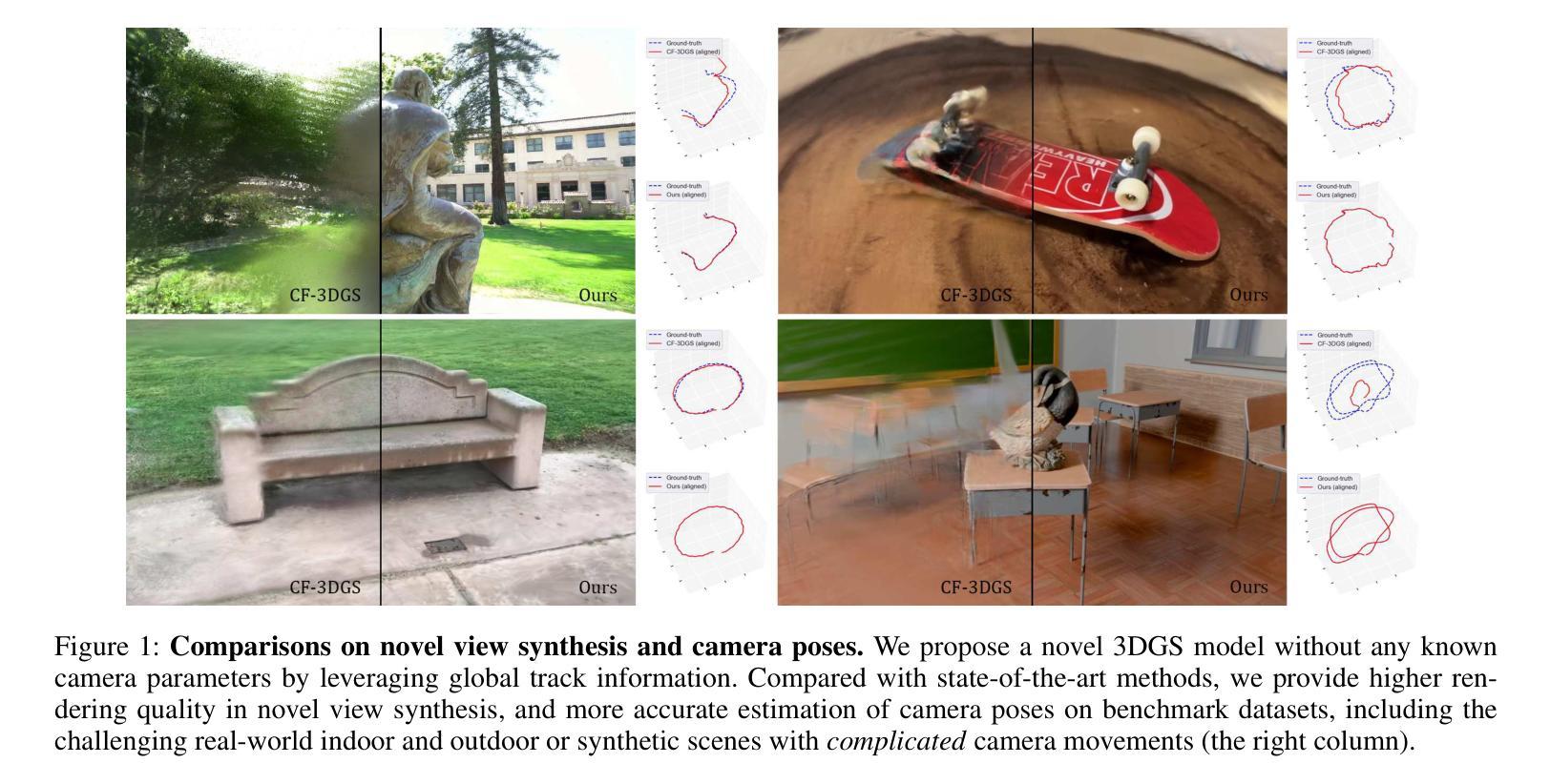 我们提出了一种名为TrackGS的新型方法,它将全局特征轨迹与3D高斯splat(3DGS)相结合,用于无COLMAP的新视角合成。虽然3DGS的渲染质量令人印象深刻,但它对预先计算准确的相机参数的依赖仍然是一个重大限制。现有的无COLMAP方法依赖于局部约束,在复杂场景中会失效。我们的关键创新之处在于利用特征轨迹来建立全局几何约束,从而实现相机参数和3D高斯的同时优化。具体来说,我们:(1)引入受轨迹约束的高斯作为几何锚点,(2)提出新的2D和3D轨迹损失以强制执行多视图一致性,(3)推导出用于相机内参优化的可微公式。在具有挑战性的真实和合成数据集上的广泛实验证明了我们的方法具有最先进的性能,相较于以前的方法具有更低的姿态误差,同时保持了出色的渲染质量。我们的方法消除了对COLMAP预处理的需求,使3DGS更易于实际应用。