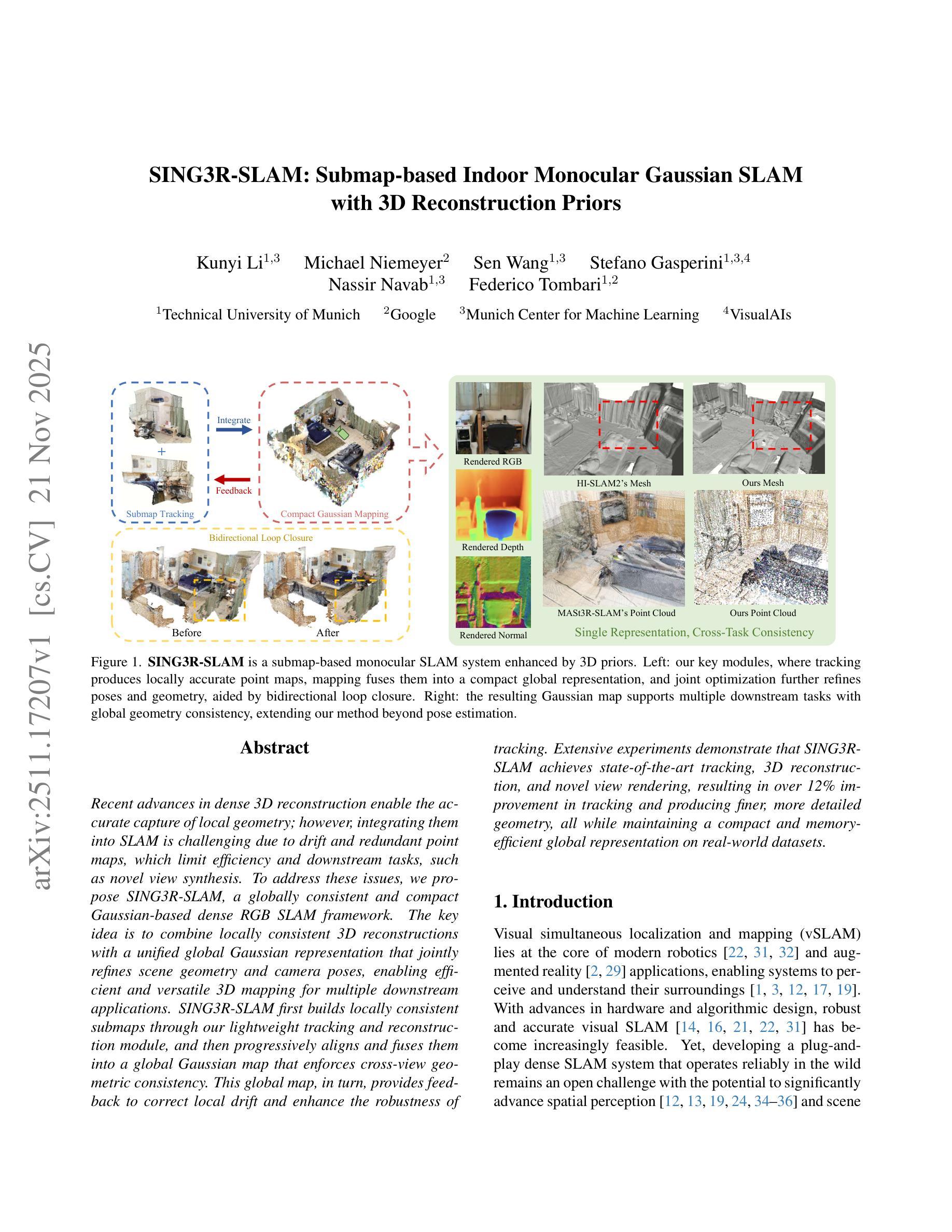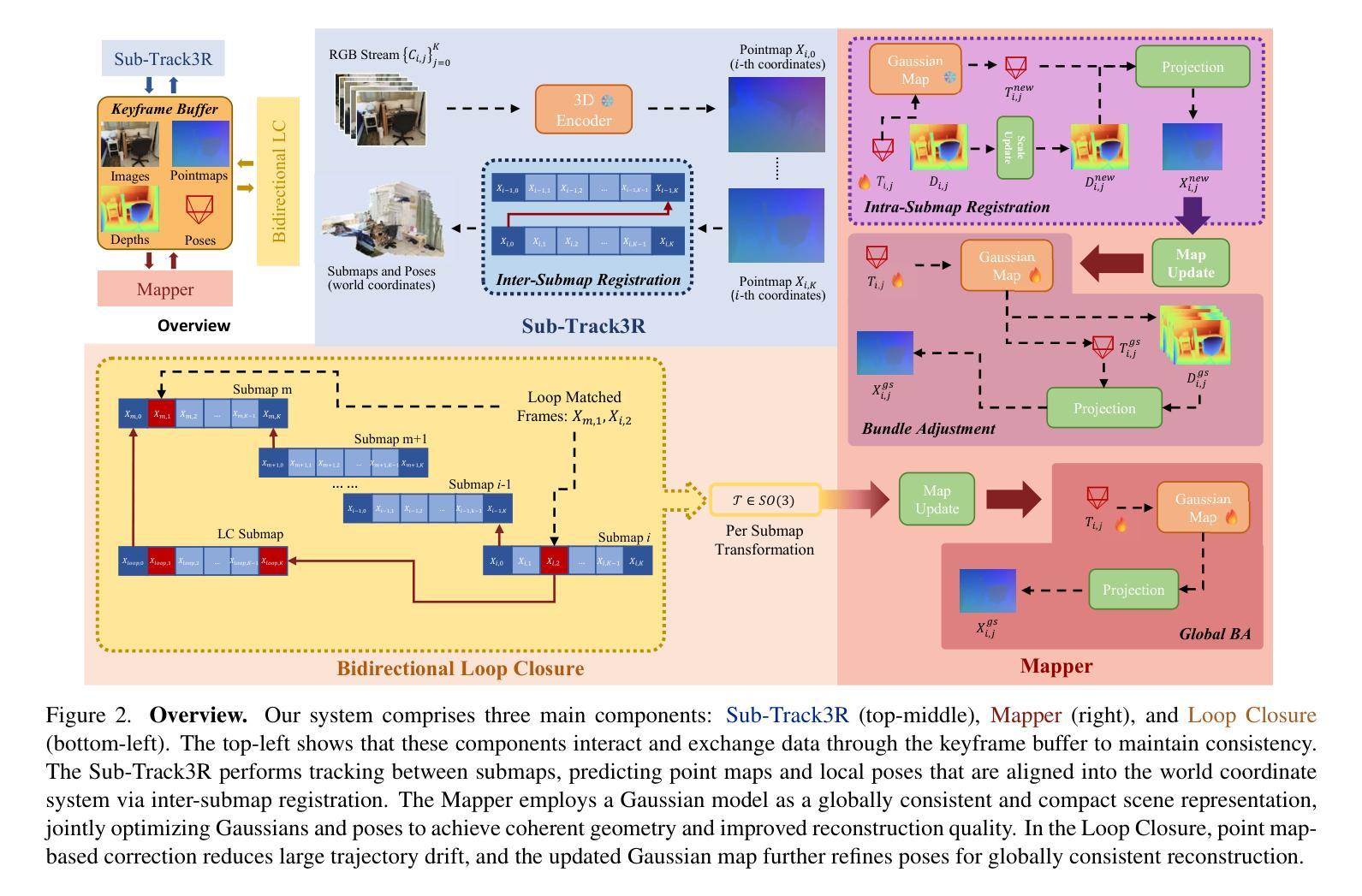 近年来,密集的三维重建技术取得了进展,能够准确地捕捉局部几何结构;然而,将其集成到SLAM中却具有挑战性,因为漂移和冗余点图限制了效率和下游任务,例如新型视图合成。为了解决这些问题,我们提出了SING3R-SLAM,这是一个基于全局一致性和紧凑高斯表示的密集RGB SLAM框架。主要思想是将局部一致的三维重建与统一的全局高斯表示相结合,共同优化场景几何和相机姿态,为多个下游应用提供高效且通用的三维映射。SING3R-SLAM首先通过我们的轻量级跟踪和重建模块构建局部一致子图,然后逐步对其对齐和融合,形成强制跨视图几何一致性的全局高斯图。全局图反过来又提供反馈,以校正局部漂移并增强跟踪的稳健性。大量实验表明,SING3R-SLAM在跟踪、三维重建和新型视图渲染方面达到了最新水平,在真实世界数据集上跟踪改进了超过12%,并产生了更精细、更详细的几何结构,同时保持了全局表示法的紧凑性和内存效率。