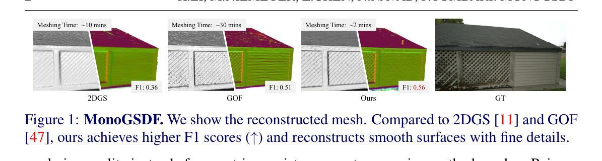 从单目图像中进行精确网格化仍然是3D视觉领域的一个关键挑战。虽然最先进的3D高斯拼贴(3DGS)方法在基于光栅化的渲染中通过合成逼真的新视角表现出色,但它们对稀疏、明确的原始模型的依赖严重限制了其在恢复无泄漏且拓扑一致的3D表面方面的能力。我们引入了MonoGSDF这一新方法,它将基于高斯模型的原始数据与神经有向距离场(SDF)相结合,以实现高质量重建。在训练过程中,SDF引导高斯的空间分布,而在推理过程中,高斯作为重建表面的先验知识,无需使用内存密集型的八叉立方体算法。为了处理任意规模的场景,我们提出了一种稳健的泛化尺度策略。多分辨率训练方案进一步提高了细节精度,而现成的估计器中的单目几何线索增强了重建质量。在真实世界数据集上的实验表明,MonoGSDF在保持高效率的同时优于先前的方法。