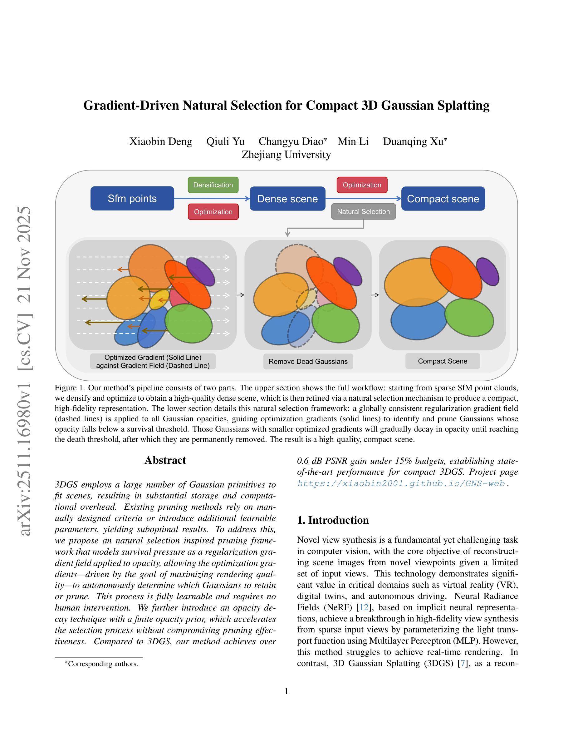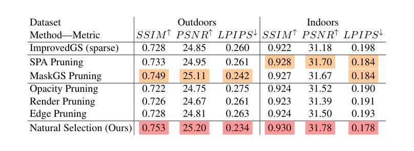本文提出一种基于自然选择理念的修剪框架,通过将生存压力建模为应用于不透明度的正则化梯度场,使优化梯度能够自主决定保留或修剪的高斯。框架完全可学习,无需人工干预。此外,引入具有有限不透明度先验的不透明度衰减技术,加快选择过程,同时不损害修剪效果。该方法实现了紧凑的3DGS的先进性能。