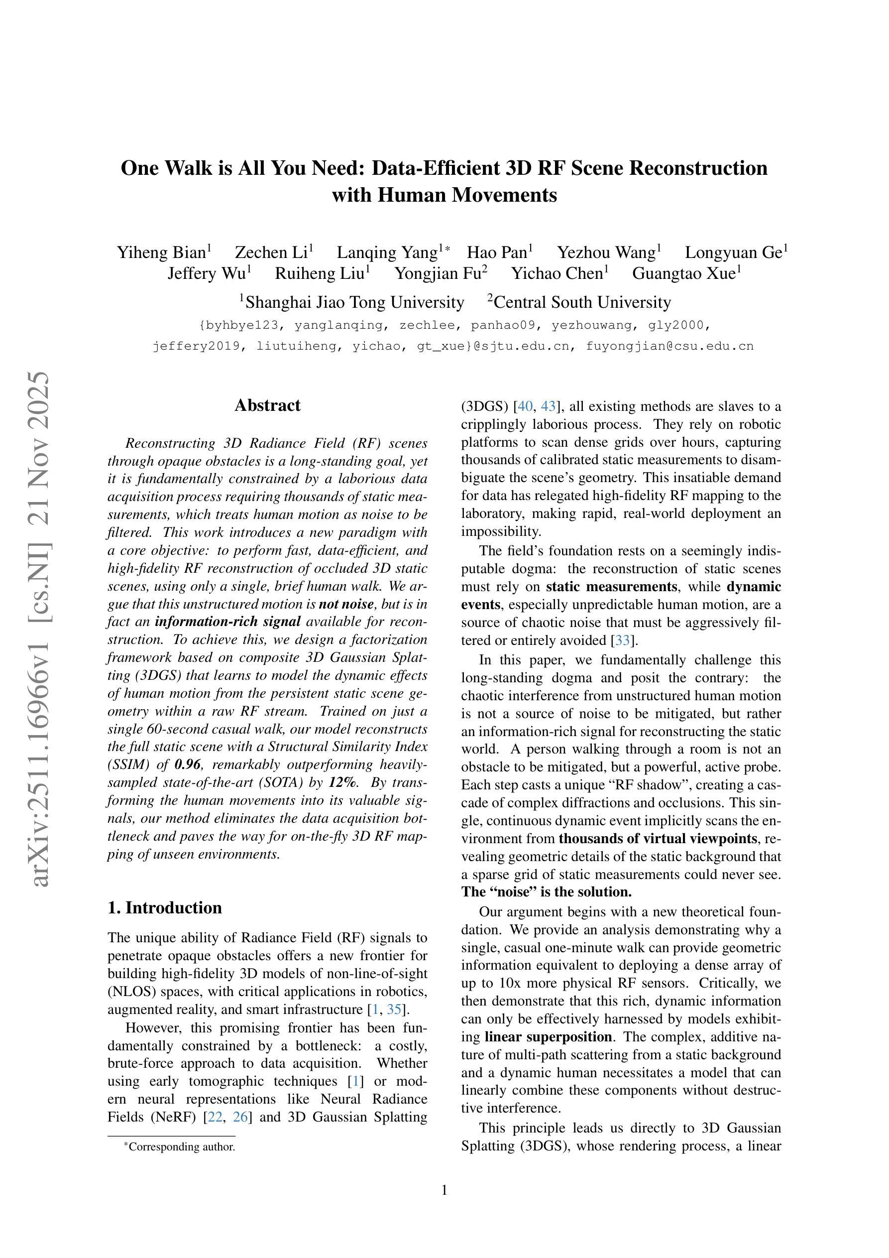通过不透明障碍物重建3D辐射场(RF)场景是一个长期的目标,但从根本上受到繁重的数据采集过程的限制,该过程需要数千个静态测量值,并将人类运动视为需要过滤的噪音。这项工作引入了一种新的模式,其核心目标是使用仅一次短暂的人类行走,实现快速、高效和高保真度的遮挡3D静态场景的RF重建。我们认为,这种非结构化运动并非噪音,而实际上是一种可用于重建的富含信息的信号。为了实现这一点,我们设计了一个基于复合3D高斯展布(3DGS)的分解框架,该框架学习从原始RF流中的持久静态场景几何来建模人类运动的动态效应。仅在一次60秒的随意行走中进行训练,我们的模型重建了完整的静态场景,结构相似性指数(SSIM)为0.96,显著优于重采样过的最新技术(SOTA)12%。通过将人类运动转化为有价值的信号,我们的方法消除了数据采集的瓶颈,为即时3DRF地图绘制未知环境铺平了道路。