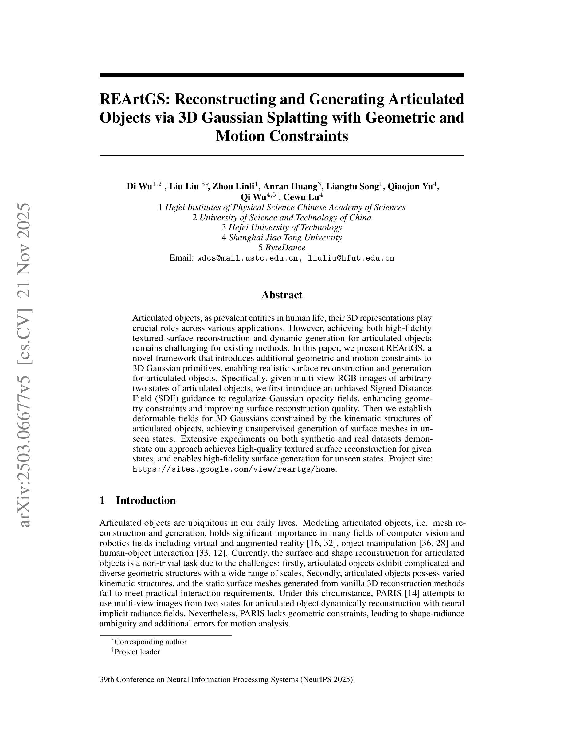 - REArtGS框架引入额外的几何和运动约束到三维高斯原始模型上,实现了关节活动物体的真实表面重建和生成。