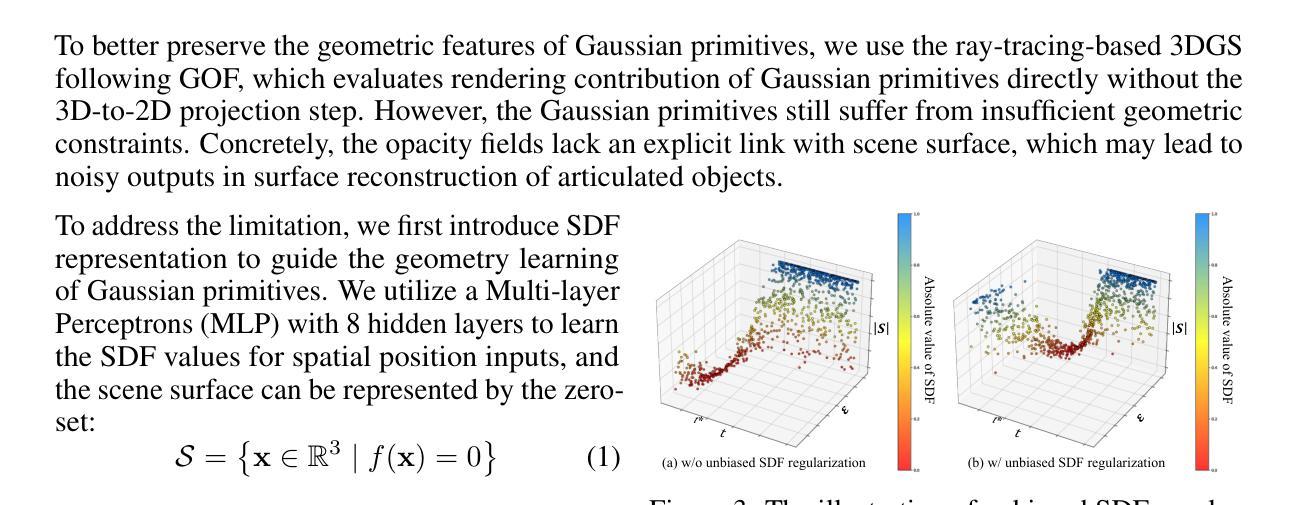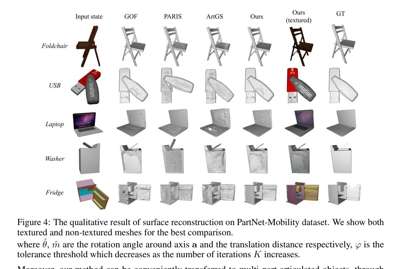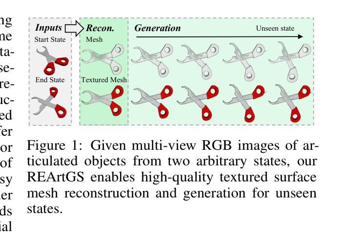关节式物体作为人类生活中普遍存在的实体,其3D表示在各种应用中扮演着至关重要的角色。然而,对于现有方法来说,实现关节式物体的高保真纹理表面重建和动态生成仍然是一个挑战。在本文中,我们提出了REArtGS,一个引入额外的几何和运动约束到3D高斯原始数据的新框架,从而实现关节式物体的逼真表面重建和生成。具体来说,给定关节式物体的任意两种状态的多视角RGB图像,我们首先引入无偏符号距离场(SDF)指导来规范高斯不透明度场,增强几何约束,提高表面重建质量。然后,我们为3D高斯建立可变形场,受关节式物体的运动结构约束,实现未见状态的表面网格的无监督生成。在合成和真实数据集上的大量实验表明,我们的方法实现了给定状态的高质量纹理表面重建,并实现了未见状态的高保真表面生成。项目网站地址为:https://sites.google.com/view/reartgs/home。