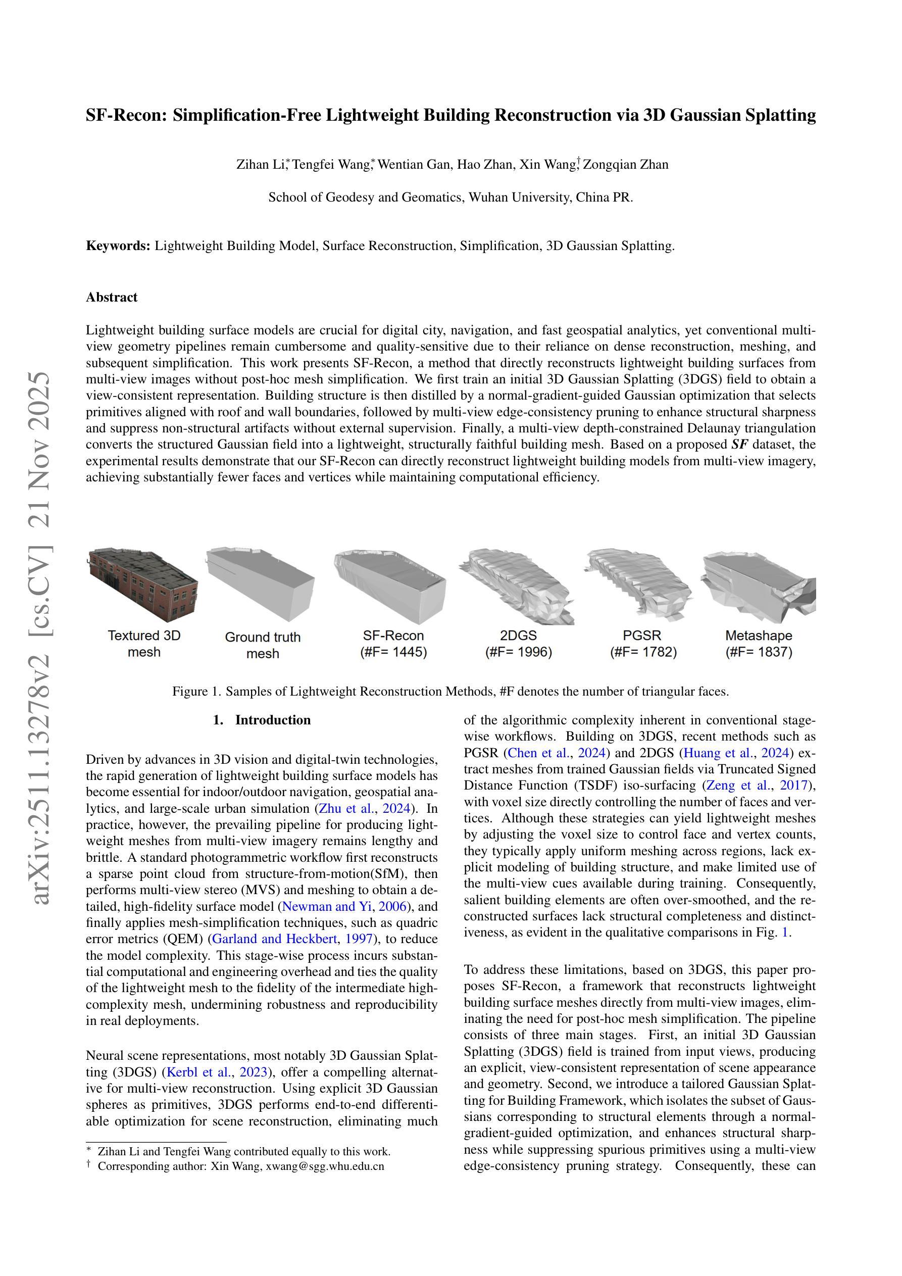 基于多视角图像,本文提出一种名为SF-Recon的轻量化建筑表面模型重建方法,无需后续网格简化步骤。通过训练初始的3D高斯喷涂(3DGS)场获得视角一致表示,随后通过法线梯度引导的高斯优化和基于多视角边缘一致性的修剪来提取建筑结构,最后转换为轻量级的结构忠实建筑网格。
