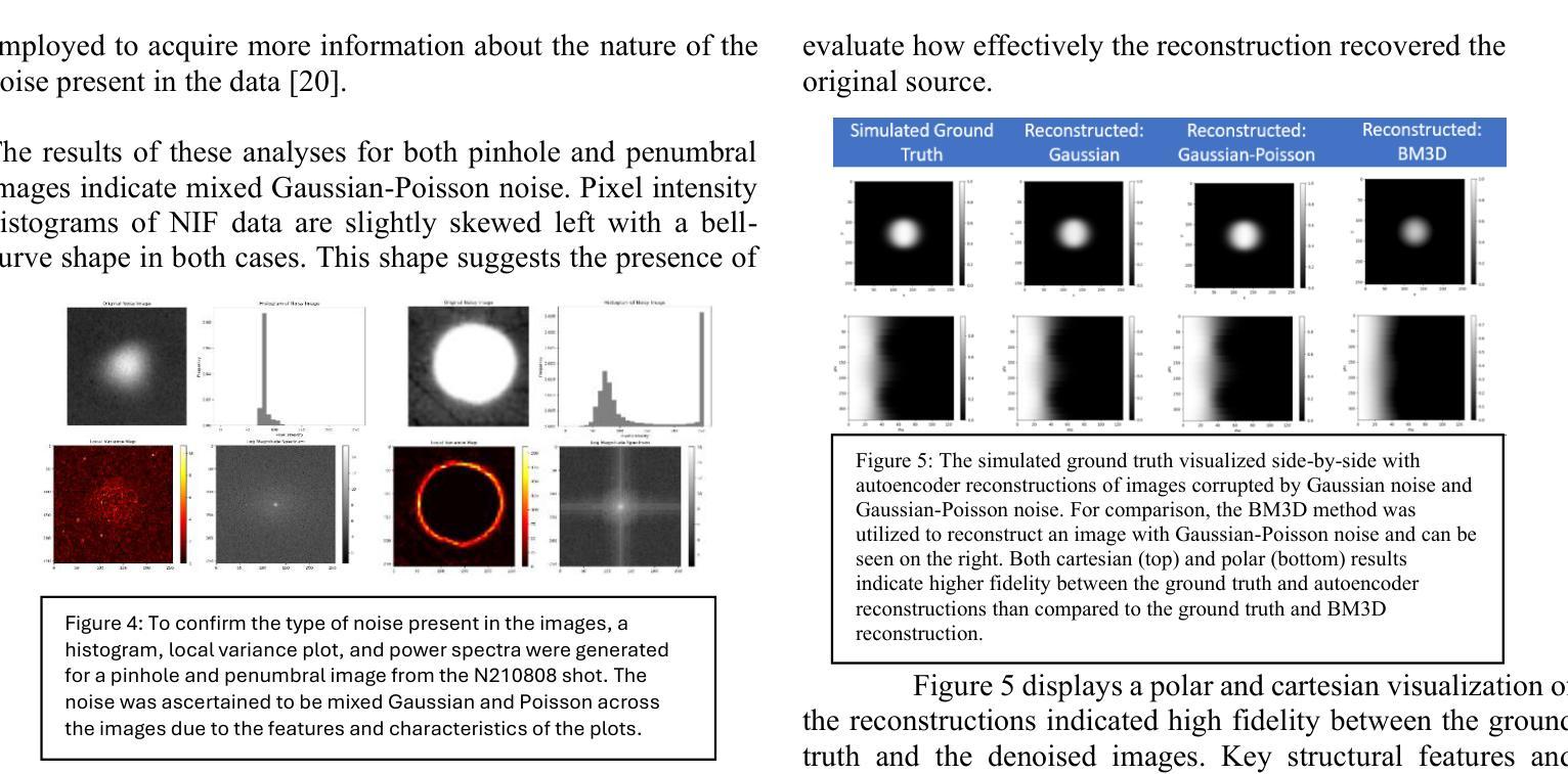 中子成像对优化惯性约束聚变(ICF)事件的分析至关重要,如国家点火设施(NIF)等。然而,中子源图像常常受到各种噪声的干扰。最常见的是高斯噪声和泊松噪声在同一图像中同时存在,掩盖了细节并模糊了边缘。过去由于缺乏ICF过程中的真实中子成像数据,机器学习的方法很少应用。但合成数据生产的进步为使用有监督和无监督的机器学习方法进行去噪提供了新的机会。本研究实现了潜伏空间中的Cohen-Daubechies-Feauveau(CDF 97)小波变换的无监督自编码器,用于混合高斯-泊松去噪。该网络成功地对中子成像数据进行了去噪,并在与前向模型生成的数据的基准测试中表现出较低的重建误差和优越的边缘保留指标,与传统的非ML过滤机制(如BM3D)相比具有优势。这为中子图像降噪和ICF实验的三维重建分析提供了有前途的进展。