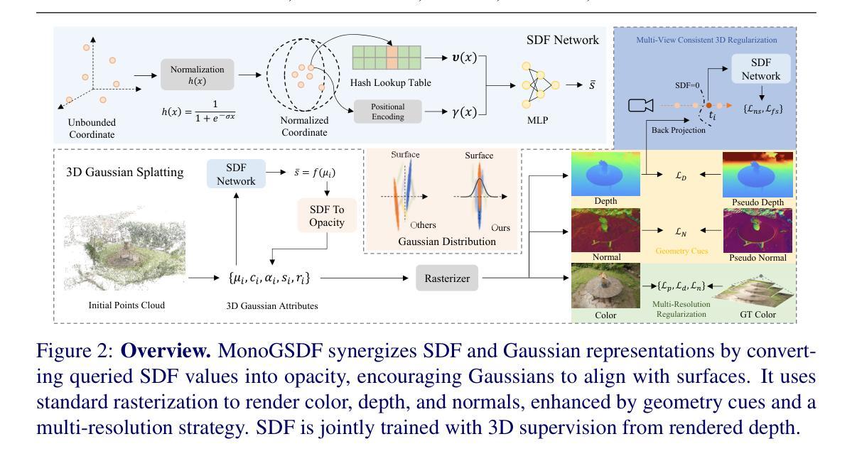 - MonoGSDF方法结合了基于高斯的基础知识和神经Signed Distance Field(SDF),以实现高质量的三维重建。