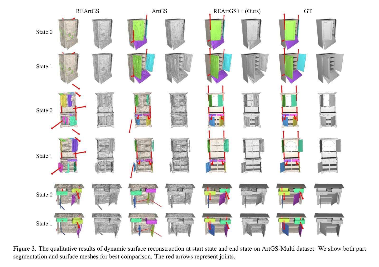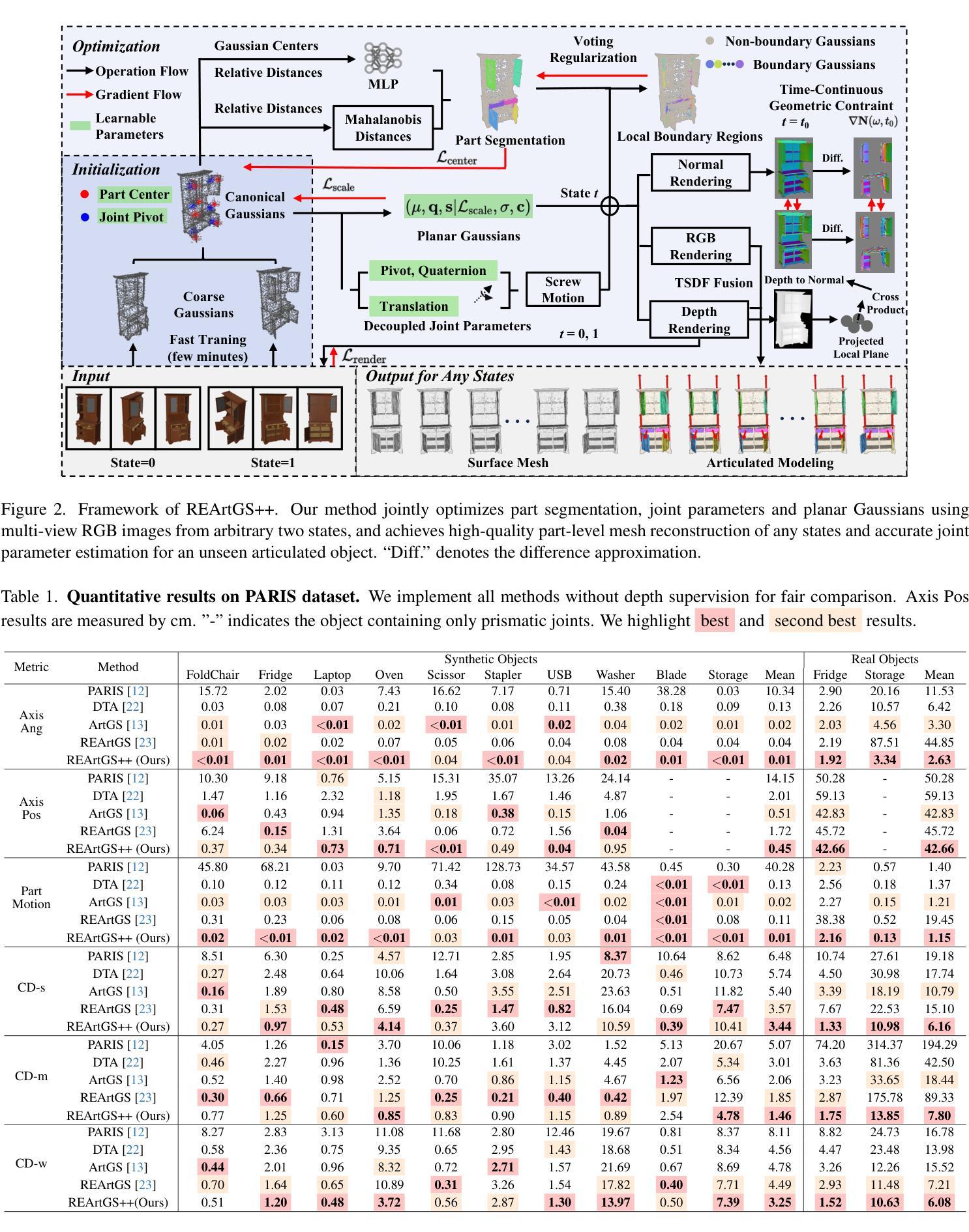 关节式物体在日常环境中普遍存在,例如抽屉和冰箱。关于其部分级别的表面重建和关节参数估计,REArtGS[引用](此处应有文献引用)引入了一种使用两种不同状态下多视角RGB图像进行类别无关的方法。然而,我们观察到REArtGS在螺丝关节或多部件物体方面仍然面临挑战,并且对未观察到的状态缺乏几何约束。在本文中,我们提出了REArtGS++,这是一种具有时间几何约束和平面高斯扩散的新型通用关节物体重建方法。我们首先为每个关节建立解耦的螺丝运动,无需类型先验,并通过部分运动混合联合优化部分感知高斯和关节参数。为了引入关节建模的时间连续几何约束,我们鼓励高斯平面化,并通过泰勒一阶展开提出平面法线和深度之间的时间一致性正则化。对合成和真实世界的关节物体的广泛实验表明,我们在通用的部分级别表面重建和关节参数估计方面优于现有方法。项目网站:https://sites.google.com/view/reartgs2/home。