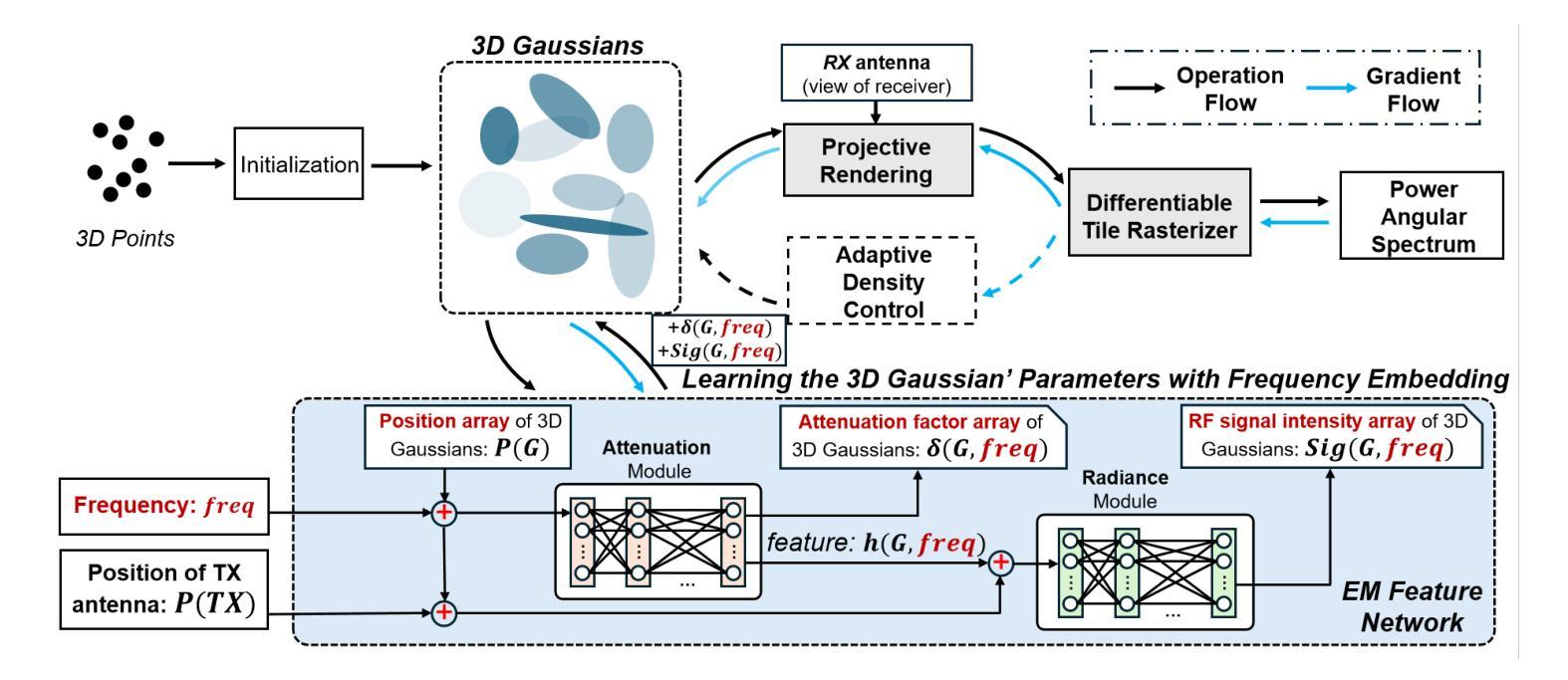 - 算法通过使用频率嵌入的电磁特征网络和三维高斯球来学习频率与传输特性之间的关系。