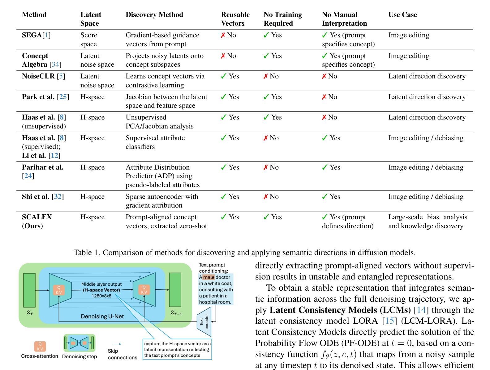 扩散模型常含有社会偏见,如与性别、种族和职业相关的刻板印象。现有分析方法局限于预设类别或依赖潜在方向的手动解读,限制了可扩展性和对微妙或意外模式的发现。我们推出SCALEX框架,可自动探索扩散模型的潜在空间。SCALEX仅使用自然语言提示从H空间提取语义方向,实现零射击解读,无需重新训练或标注。这允许对任意概念进行系统比较,并大规模发现内部模型关联。SCALEX能检测职业提示中的性别偏见,对身份描述符进行语义对齐排名,揭示无监督下的集群概念结构。通过将提示直接与潜在方向联系,SCALEX使扩散模型的偏见分析更具可扩展性、可解释性和扩展性,优于以往的方法。