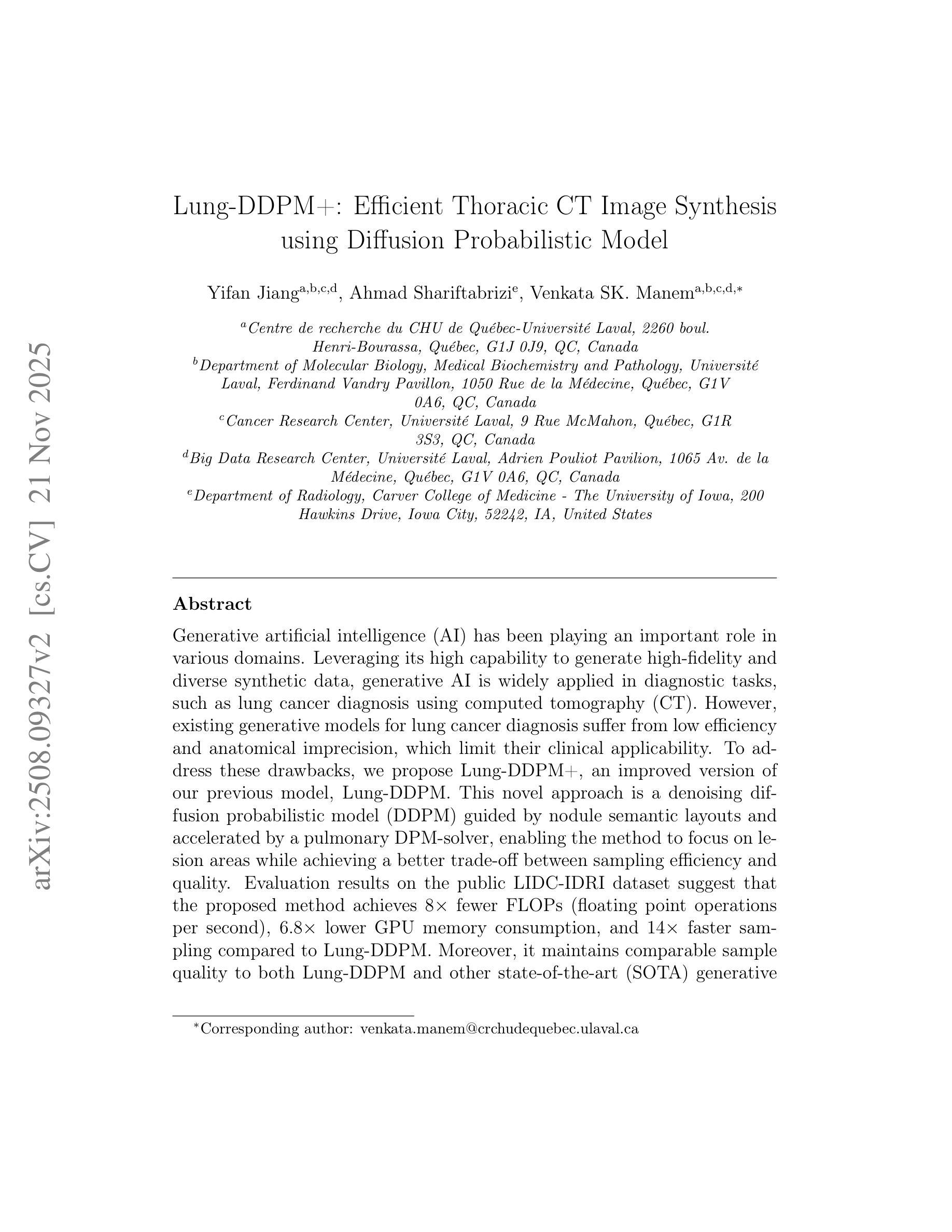 生成式人工智能(AI)在各种领域都扮演着重要角色。由于其能够生成高保真和多样化的合成数据的高能力,生成式AI被广泛应用于诊断任务,如使用计算机断层扫描(CT)进行肺癌诊断。然而,现有的肺癌诊断生成模型存在效率低和解剖不精确的问题,限制了其在临床上的适用性。为了解决这些缺点,我们提出了Lung-DDPM+模型,这是我们之前Lung-DDPM模型的改进版。这种新方法是一种基于结节语义布局引导的降噪扩散概率模型(DDPM),并使用肺部DPM求解器进行加速,使该方法能够专注于病变区域,同时在采样效率和质量之间取得更好的平衡。在公共LIDC-IDRI数据集上的评估结果表明,所提出的方法实现了每秒浮点运算量减少了8倍,GPU内存消耗降低了6.8倍,采样速度提高了14倍。此外,它在两个下游分割任务中的样本质量保持与Lung-DDPM和其他最先进的生成模型相当。我们还通过经验丰富的放射科医生进行了视觉图灵测试,证明了该方法生成的合成样本的高级质量和保真度。这些实验结果证明,Lung-DDPM+能够有效地生成具有肺结节的高质量胸部CT图像,突显其在更广泛应用中的潜力,如通用肿瘤合成和医学成像中的病变生成。代码和预先训练好的模型可在https://github.com/Manem-Lab/Lung-DDPM-PLUS找到。