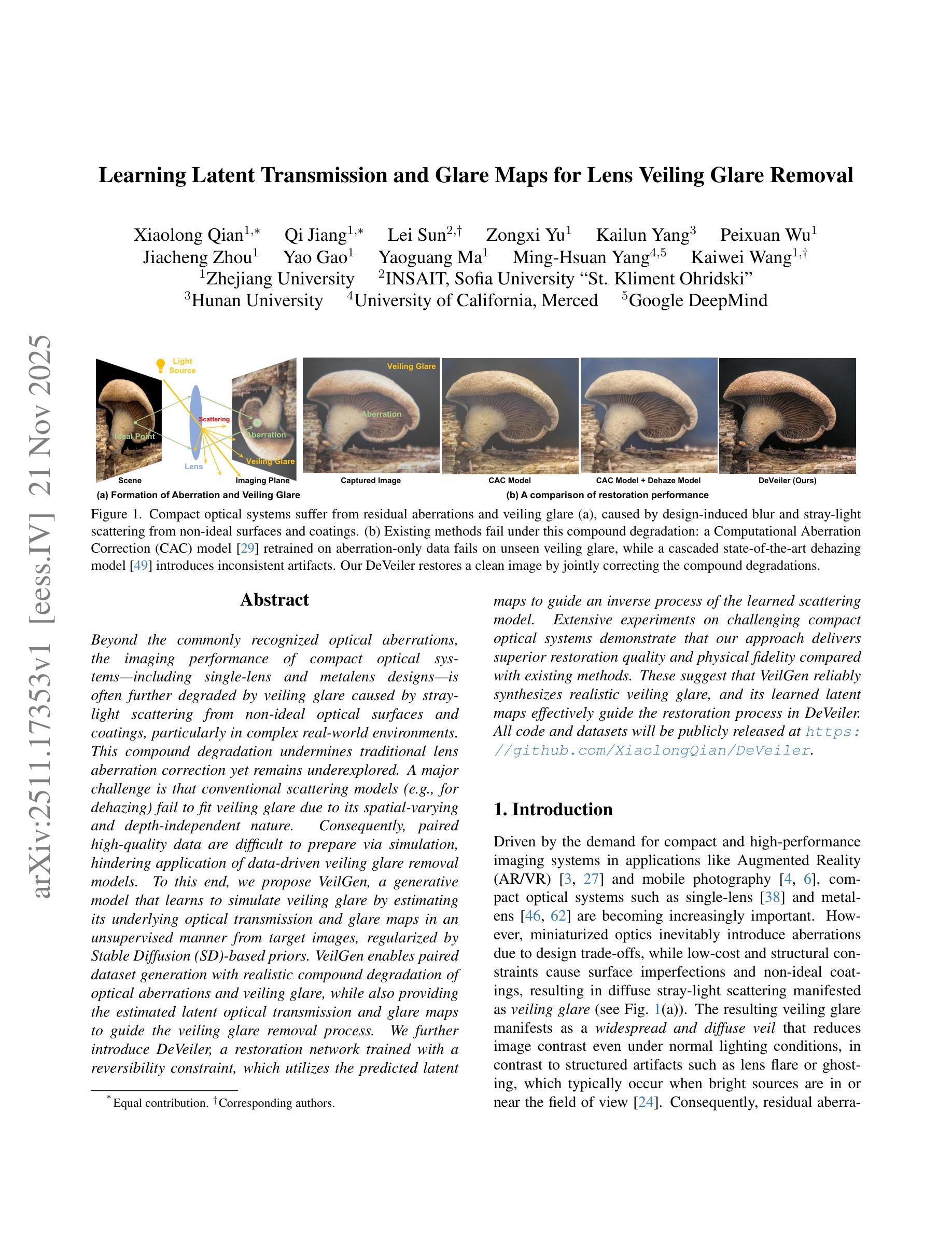 除了公认的光学畸变,紧凑光学系统的成像性能(包括单透镜和金属透镜设计)通常还会受到由非理想光学表面和涂层产生的散射光所引起的眩光干扰,特别是在复杂的现实环境中。这种复合退化影响传统透镜的畸变校正,但仍未得到充分探索。主要挑战在于传统的散射模型(例如用于去雾的模型)无法适应由于空间变化和深度独立性质导致的眩光干扰。因此,通过仿真准备配套的高质量数据非常困难,阻碍了数据驱动的去眩光模型的应用。为此,我们提出了VeilGen,这是一种生成模型,能够估计目标图像中的潜在光学传输和眩光地图,以无监督的方式模拟眩光干扰,并由基于稳定扩散的先验进行正则化。VeilGen能够生成具有现实光学畸变和眩光干扰的配套数据集,同时提供估计的潜在光学传输和眩光地图来指导去眩光过程。我们还介绍了使用可逆性约束进行训练的恢复网络DeVeiler,该网络利用预测的潜在地图来指导学习散射模型的逆向过程。在具有挑战性的紧凑光学系统上的大量实验表明,我们的方法提供了优于现有方法的恢复质量和物理保真度。这表明VeilGen能够可靠地合成现实的眩光干扰,其学习的潜在地图可以有效地指导DeVeiler中的恢复过程。所有代码和数据集将在https://github.com/XiaolongQian/DeVeiler上公开发布。