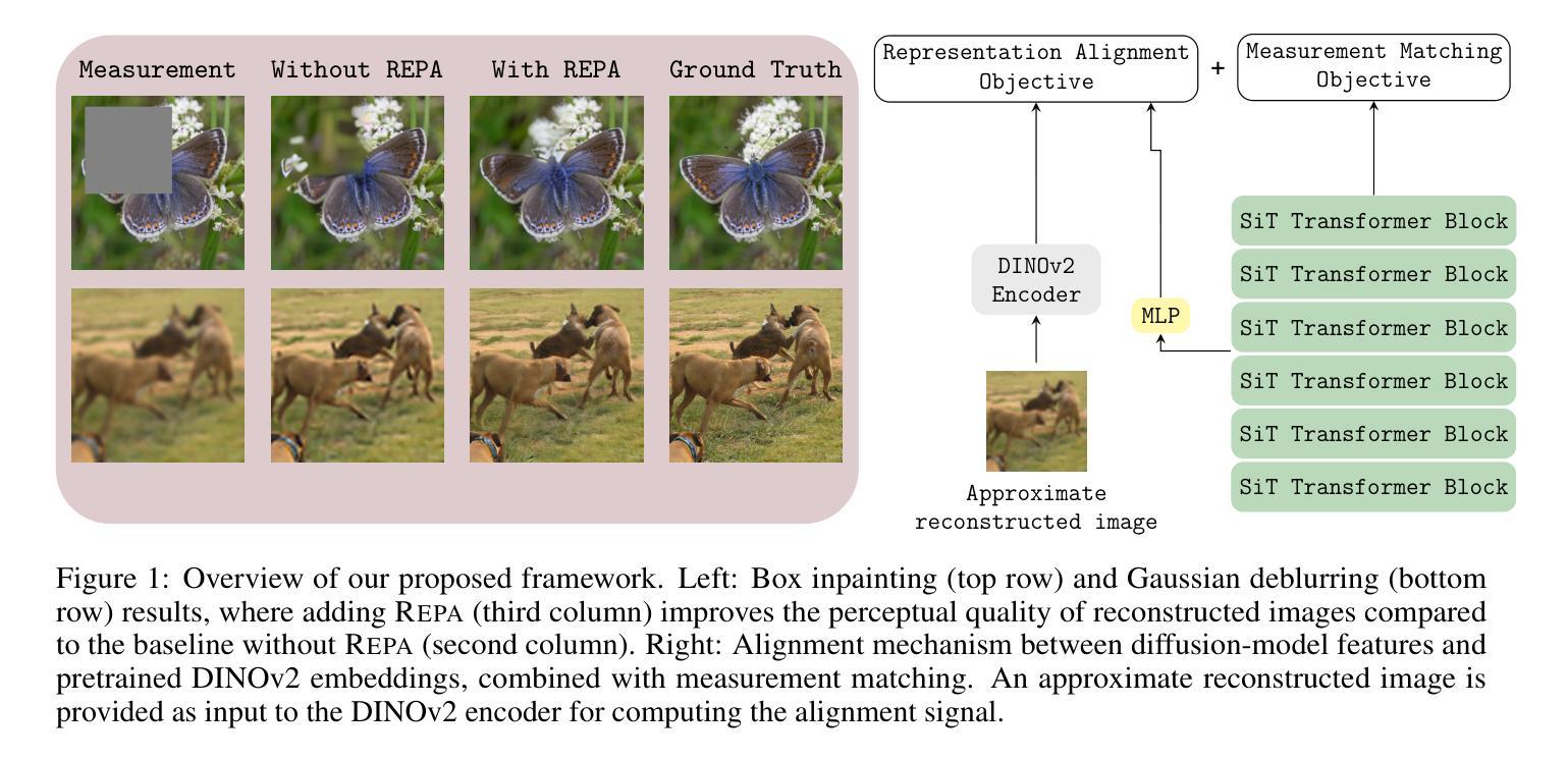 最近的研究表明,通过在扩散或基于流的生成模型的内部表示与预训练的自我监督编码器的内部表示之间强制执行对齐,可以提供一个强大的归纳偏置,从而改善收敛性和样本质量。在这项工作中,我们将这一理念扩展到逆问题,其中预训练的生成模型被用作先验。我们提出在扩散或基于流的模型与预训练的自我监督视觉编码器(如DINOv2)之间应用表示对齐(REPA),以引导推理时间点的重建过程。虽然逆问题中无法获得真实信号,但我们表明,通过与目标特征的近似对齐模型表示,可以显著提高重建的保真度和感知现实感。我们提供理论结果,展示(a)REPA正则化与DINOv2嵌入空间中的发散度量的关系,(b)REPA更新如何引导模型的内部表示朝向干净图像的表示。这些结果提供了REPA在提高感知保真度方面的作用。最后,我们通过将其集成到多个最新逆问题求解器中来证明我们方法的一般性。在超分辨率、盒子补全、高斯去模糊和运动去模糊方面的广泛实验证实,我们的方法在各种任务中都能提高重建质量,同时通过减少所需的离散化步骤数量来提高效率,且不损害底层求解器的性能。