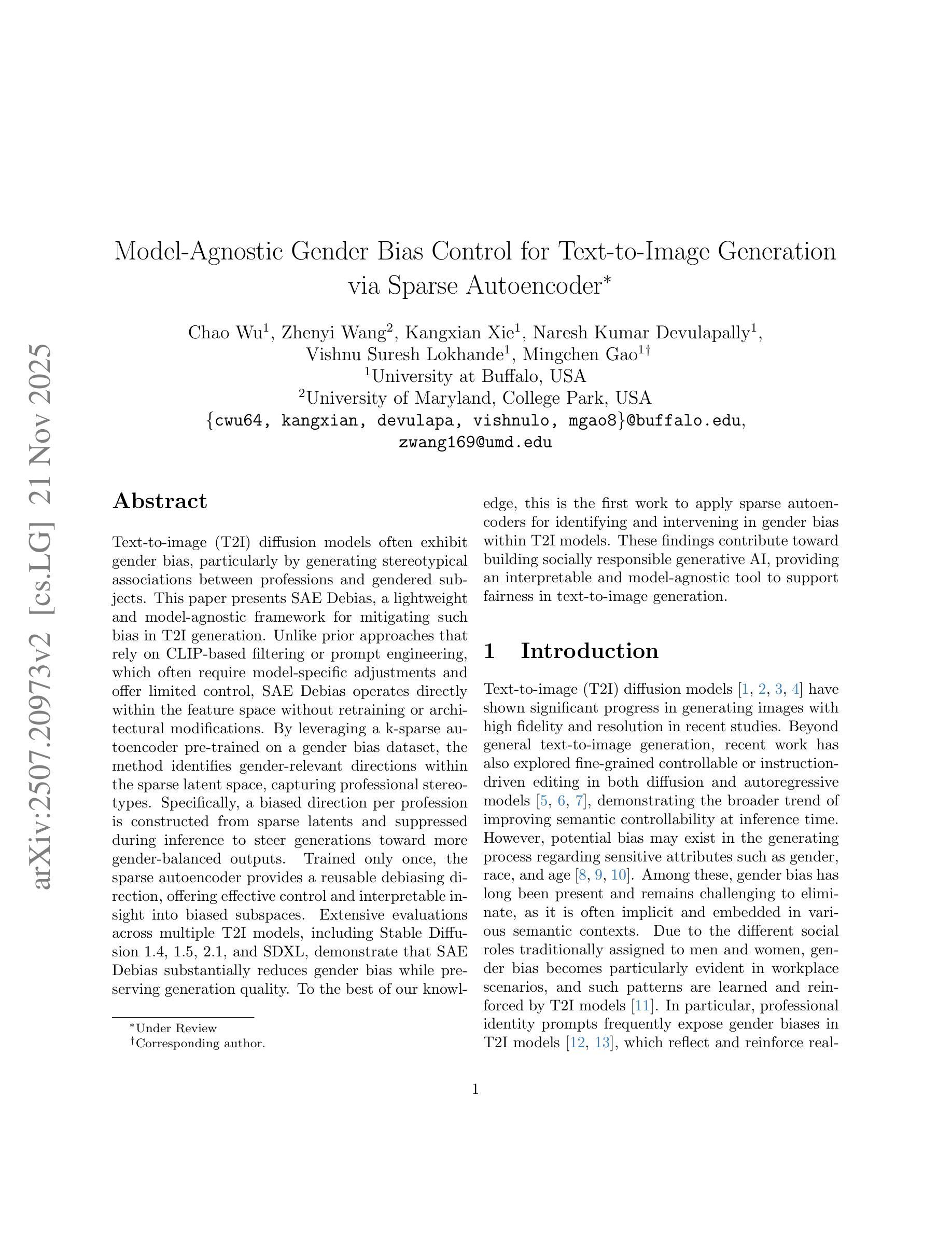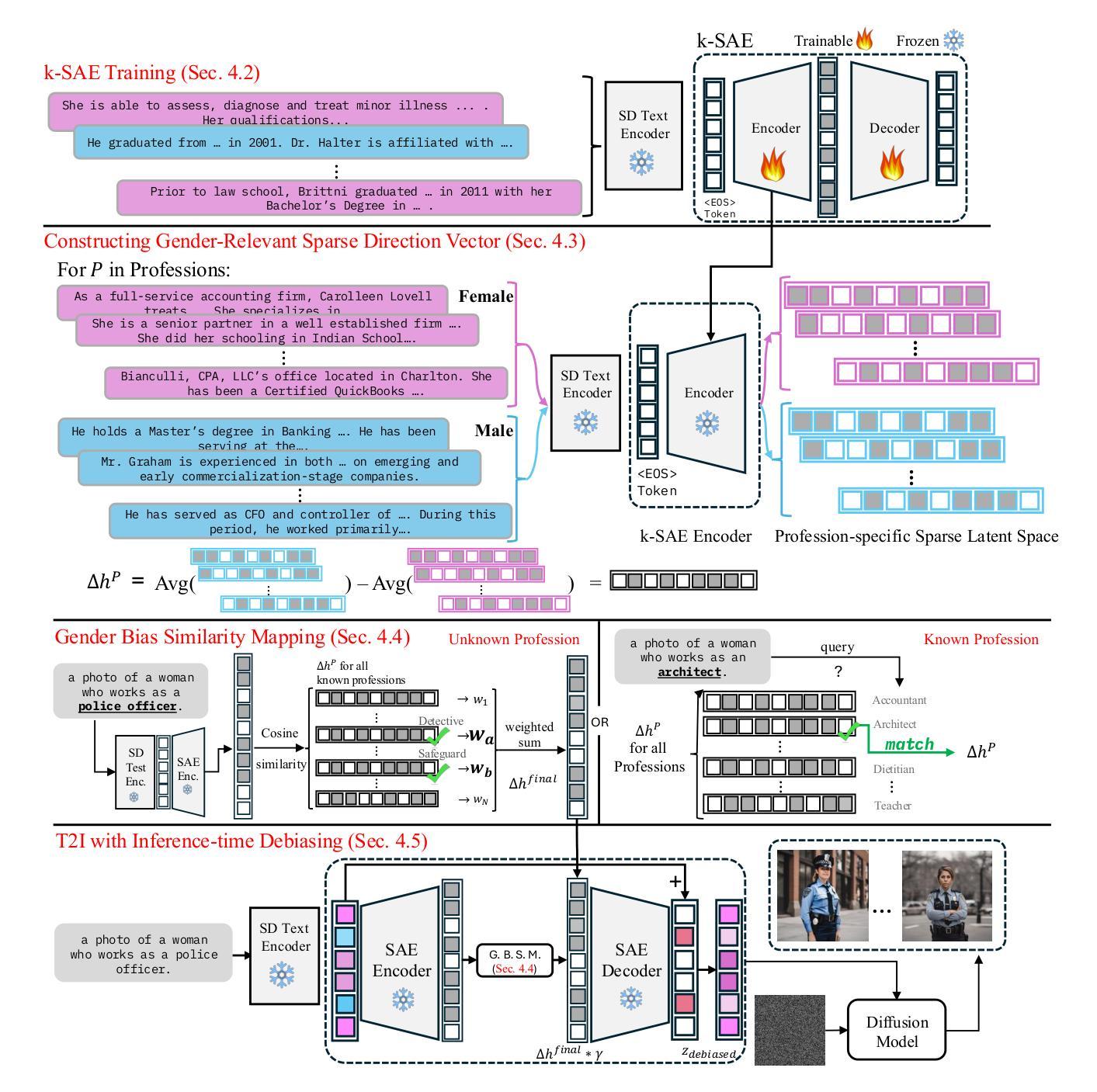 本文提出了一种轻量级、模型无关的去偏框架SAE Debias,用于缓解文本到图像生成中的性别偏见问题。该框架通过运用预训练的k稀疏自编码器在特征空间内直接操作,无需重新训练或修改架构,即可有效识别并干预性别相关的偏见方向,从而生成更平衡的图像输出。该框架在多个文本到图像模型上的评估结果表明,其在减少性别偏见的同时保持了生成质量。