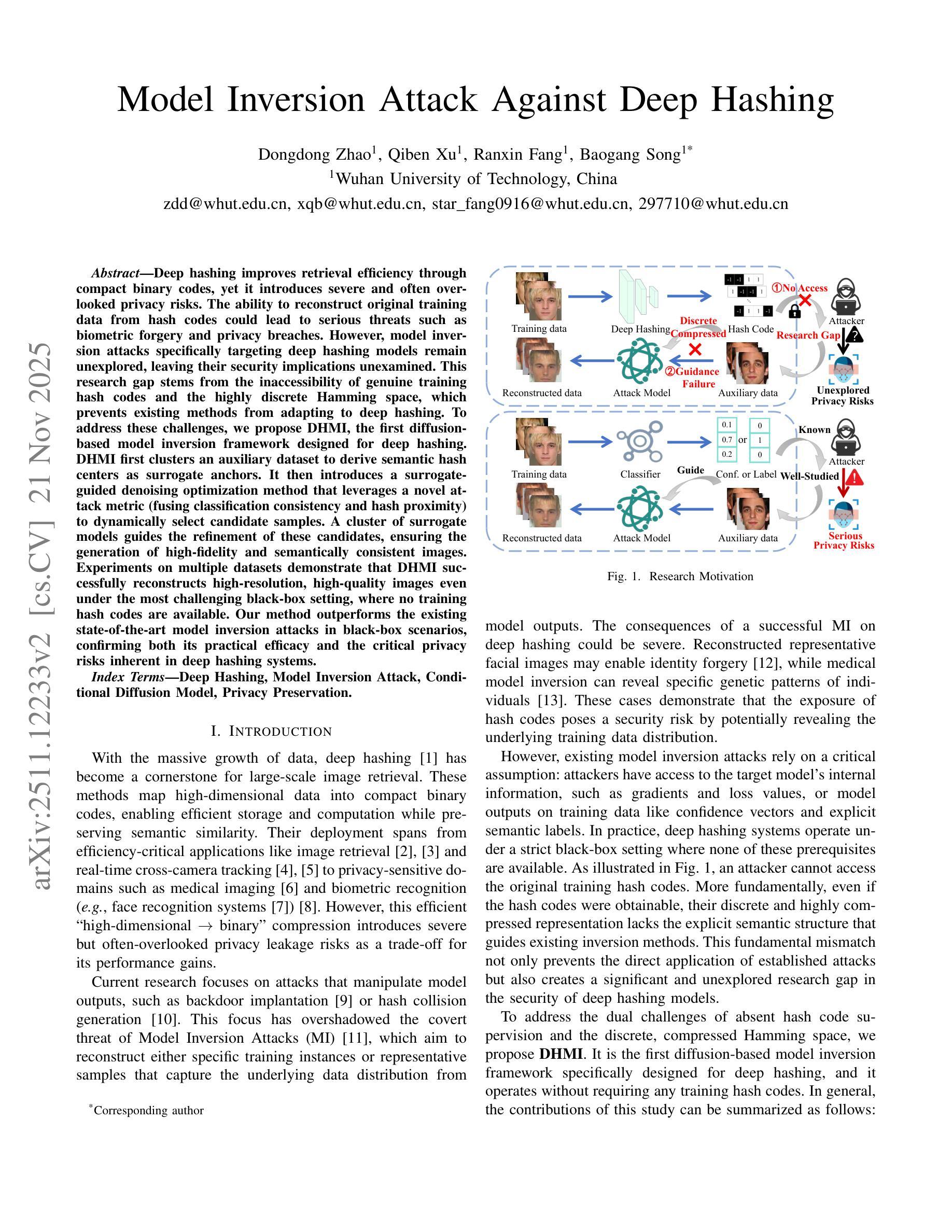 深度哈希通过紧凑的二进制编码提高了检索效率,但同时也引入了严重且常被忽视的隐私风险。从哈希代码中重建原始训练数据的能力可能导致生物特征伪造和隐私泄露等严重威胁。然而,专门针对深度哈希模型的模型反转攻击尚未被探索,其安全影响也未被检查。这一研究空白源于真实的训练哈希代码无法访问以及高度离散的汉明空间,这使得现有方法无法适应深度哈希。为了解决这些挑战,我们提出了DHMI,这是第一个针对深度哈希的基于扩散的模型反转框架。DHMI首先对一个辅助数据集进行聚类,以导出语义哈希中心作为替代锚点。然后,它引入了一种替代引导去噪优化方法,该方法利用一种新型攻击指标(融合分类一致性和哈希接近度)来动态选择候选样本。一系列替代模型引导这些候选者的优化,确保生成高保真和语义上一致的图片。在多个数据集上的实验表明,即使在无法获取训练哈希代码的最具挑战性的黑箱设置下,DHMI也能成功重建高分辨率、高质量的图像。我们的方法在黑箱场景中的模型反转攻击方面超过了现有的最先进的水平,证实了其实际效果和深度哈希系统固有的关键隐私风险。