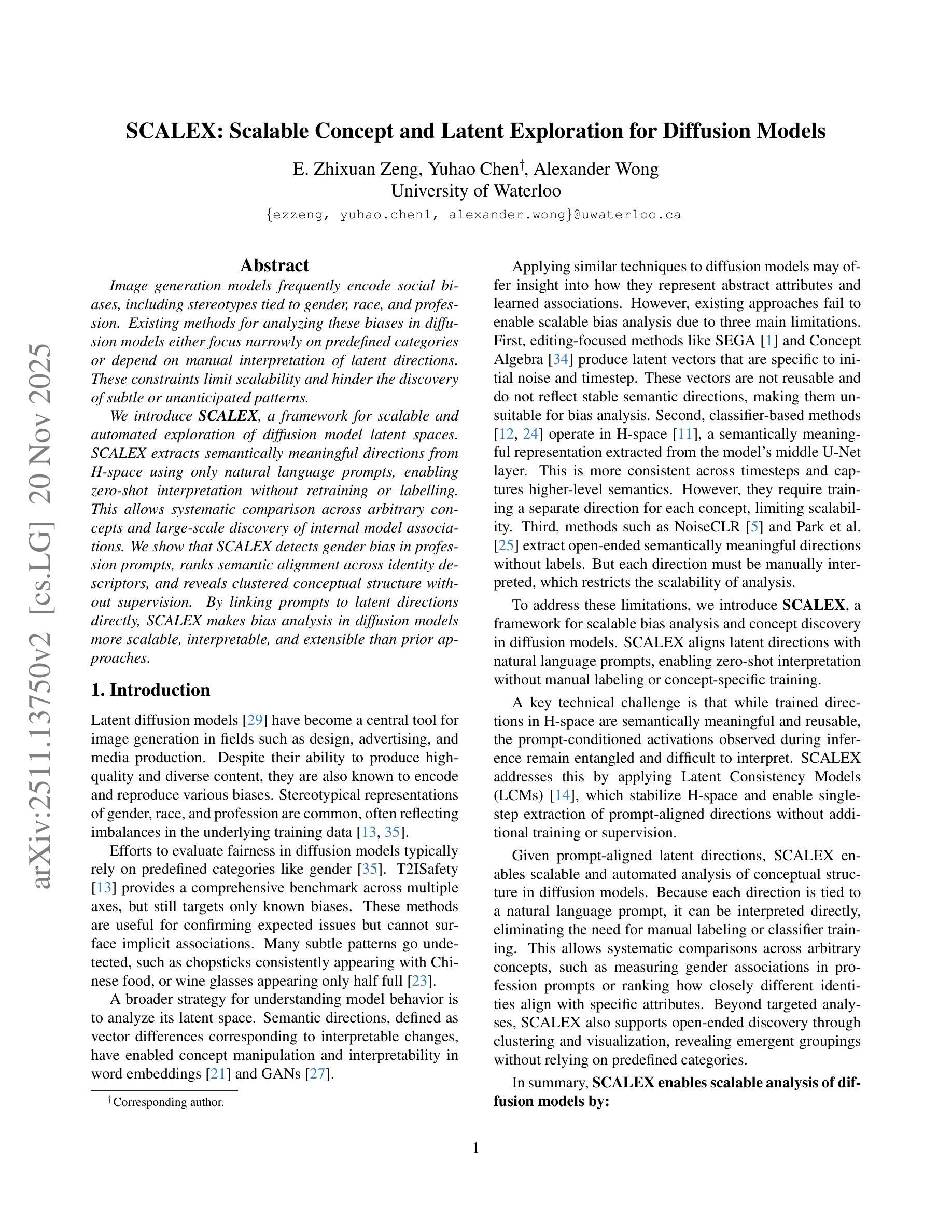 图像生成模型经常编码社会偏见,包括与性别、种族和职业相关的刻板印象。现有分析扩散模型中这些偏见的方法要么局限于预设的类别,要么依赖于潜在方向的手动解释。这些限制阻碍了模型的扩展性,并妨碍了发现微妙或意想不到的模式。我们介绍了SCALEX,这是一个用于可扩展和自动化探索扩散模型潜在空间的框架。SCALEX仅使用自然语言提示从H空间提取语义上有意义的方向,实现零样本解释,无需重新训练或标记。这允许对任意概念进行系统比较,并大规模发现内部模型关联。我们展示了SCALEX在职业提示中检测到性别偏见,对身份描述符进行语义对齐排名,并在无监督的情况下揭示聚类概念结构。通过将提示直接与潜在方向联系,SCALEX使扩散模型中的偏见分析比以往方法更具可扩展性、可解释性和可扩展性。