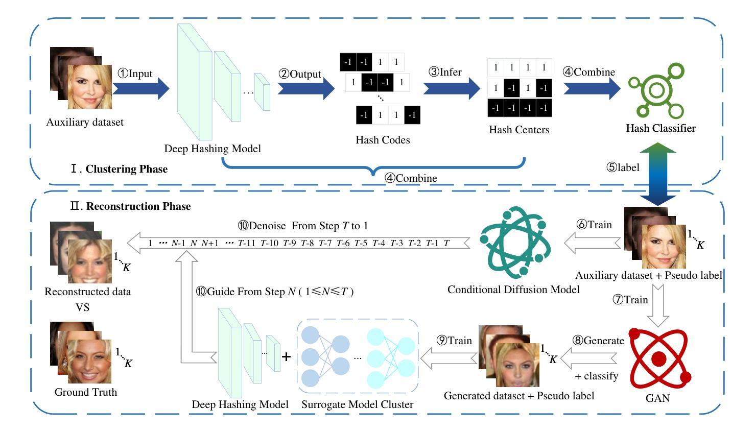深度哈希技术通过紧凑的二进制编码提高了检索效率,但同时也带来了严重的隐私风险,可能被用于生物特征伪造和隐私泄露等。针对深度哈希模型的安全隐患尚未得到充分研究,原因在于无法获取真实的训练哈希码以及汉明空间的离散性。本研究提出DHMI,首个针对深度哈希的扩散模型反转框架。DHMI通过聚类辅助数据集得到语义哈希中心作为替代锚点,并引入一种新型攻击度量标准来动态选择候选样本。实验证明,DHMI在无法使用训练哈希码的黑盒场景下,仍能成功重构高质量图像。