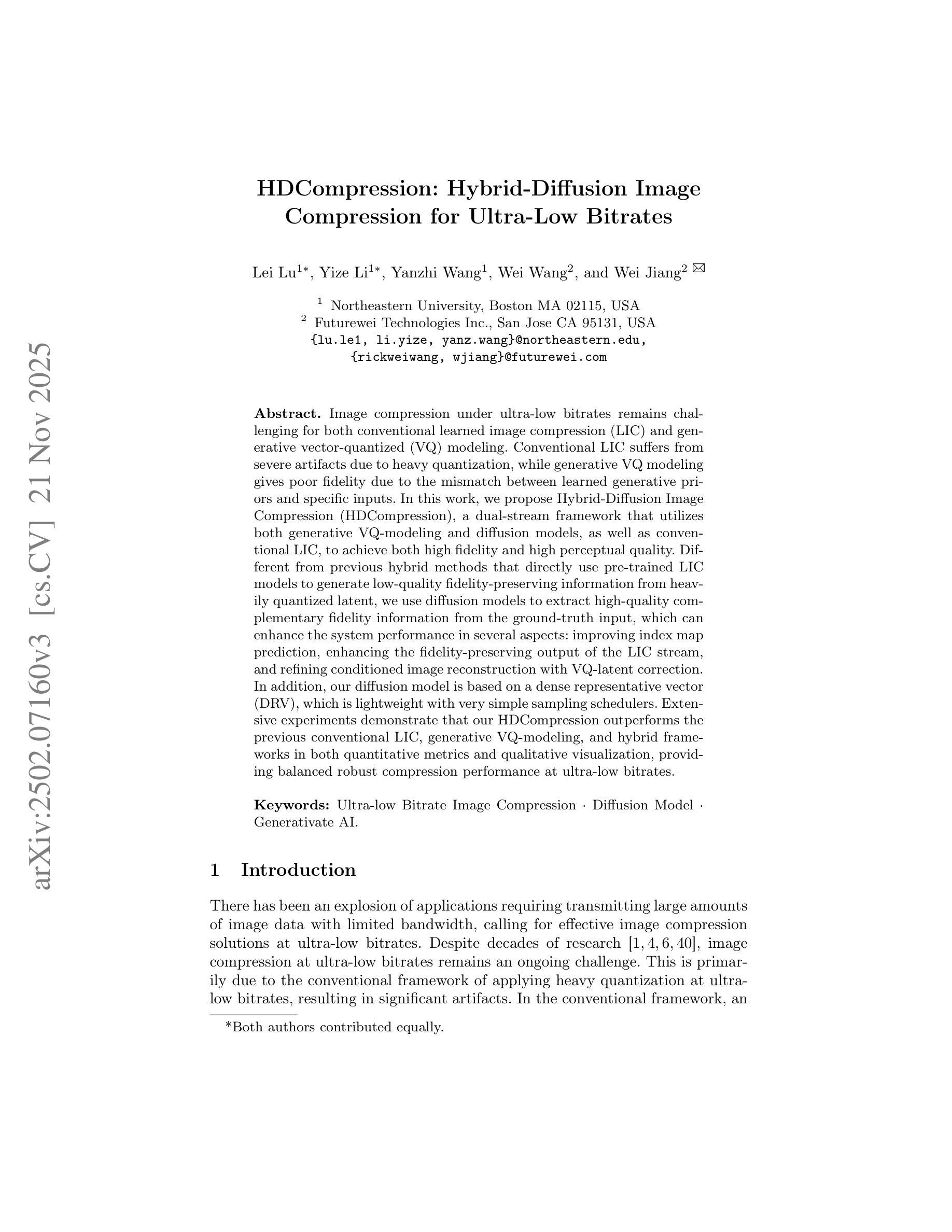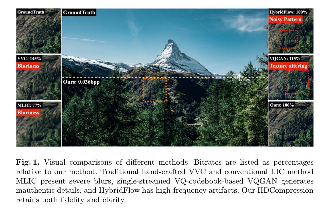 图像在超低比特率下的压缩对于传统的图像压缩(LIC)和生成向量量化(VQ)建模仍然具有挑战性。传统LIC由于重度量化而产生严重伪影,而生成VQ建模则由于生成的先验知识与特定输入之间存在不匹配而导致保真度降低。在这项工作中,我们提出了混合扩散图像压缩(HDCompression),这是一个双流传输框架,结合了生成VQ建模和扩散模型以及传统LIC,以实现高保真和高感知质量。与之前直接使用预训练的LIC模型从重度量化的潜在数据中生成低质量保真信息的混合方法不同,我们使用扩散模型从原始真实输入中提取高质量互补的保真信息,这可以在多方面提高系统性能:改善索引映射预测,提高LIC流的保真保持输出,并细化有条件的图像重建与VQ潜在校正。此外,我们的扩散模型基于密集表示向量(DRV),具有非常简单的采样调度器且轻量化。大量实验表明,我们的HDCompression在定量指标和定性可视化方面都优于之前的传统LIC、生成VQ建模和混合框架,在超低比特率下提供了平衡的稳健压缩性能。