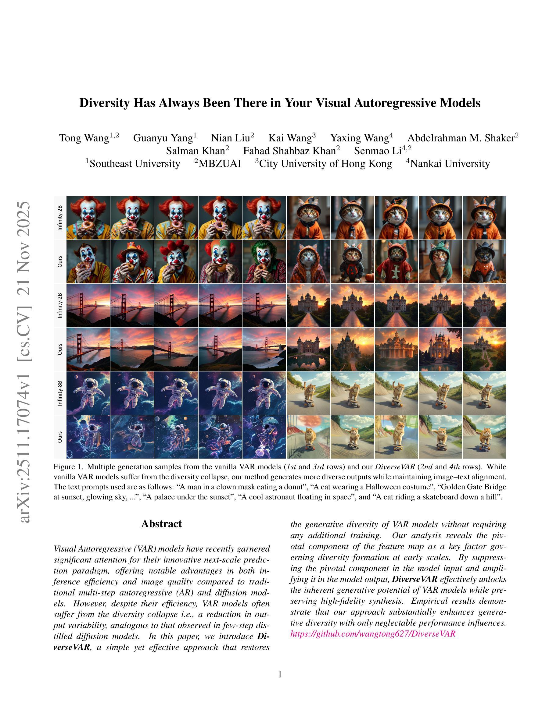 本文介绍了DiverseVAR模型,这是一种针对视觉自回归(VAR)模型的改进方法,旨在恢复其生成多样性,同时保持高效推理和高保真合成。通过抑制特征映射中的关键成分并放大模型输出中的关键成分,DiverseVAR能够有效解锁VAR模型的内在生成潜力。实证结果表明,该方法显著提高了生成多样性,同时性能影响较小。