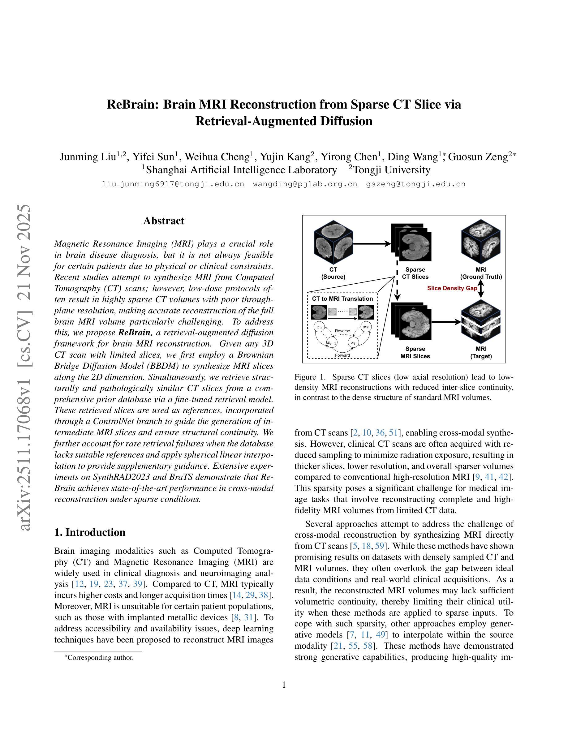 磁共振成像(MRI)在脑疾病诊断中发挥着至关重要的作用,但由于某些患者的生理或临床限制,并非总是可行。最近的研究尝试从计算机断层扫描(CT)中合成MRI,但低剂量协议通常会导致高度稀疏的CT体积,平面外分辨率较差,使得准确重建完整的脑MRI体积特别具有挑战性。针对这一问题,我们提出了ReBrain,这是一个增强检索的扩散框架,用于脑MRI重建。对于任何具有有限切片的3D CT扫描,我们首先采用布朗桥扩散模型(BBDM)沿2D维度合成MRI切片。同时,我们通过精细调整的检索模型从综合先验数据库中检索结构和病理相似的CT切片。这些检索到的切片用作参考,通过ControlNet分支融入,以引导中间MRI切片的生成,并确保结构连续性。当数据库缺乏合适的参考时,我们进一步考虑罕见的检索失败情况,并应用球形线性插值以提供补充指导。在SynthRAD2023和BraTS上的广泛实验表明,ReBrain在稀疏条件下的跨模态重建中达到了最先进的性能。