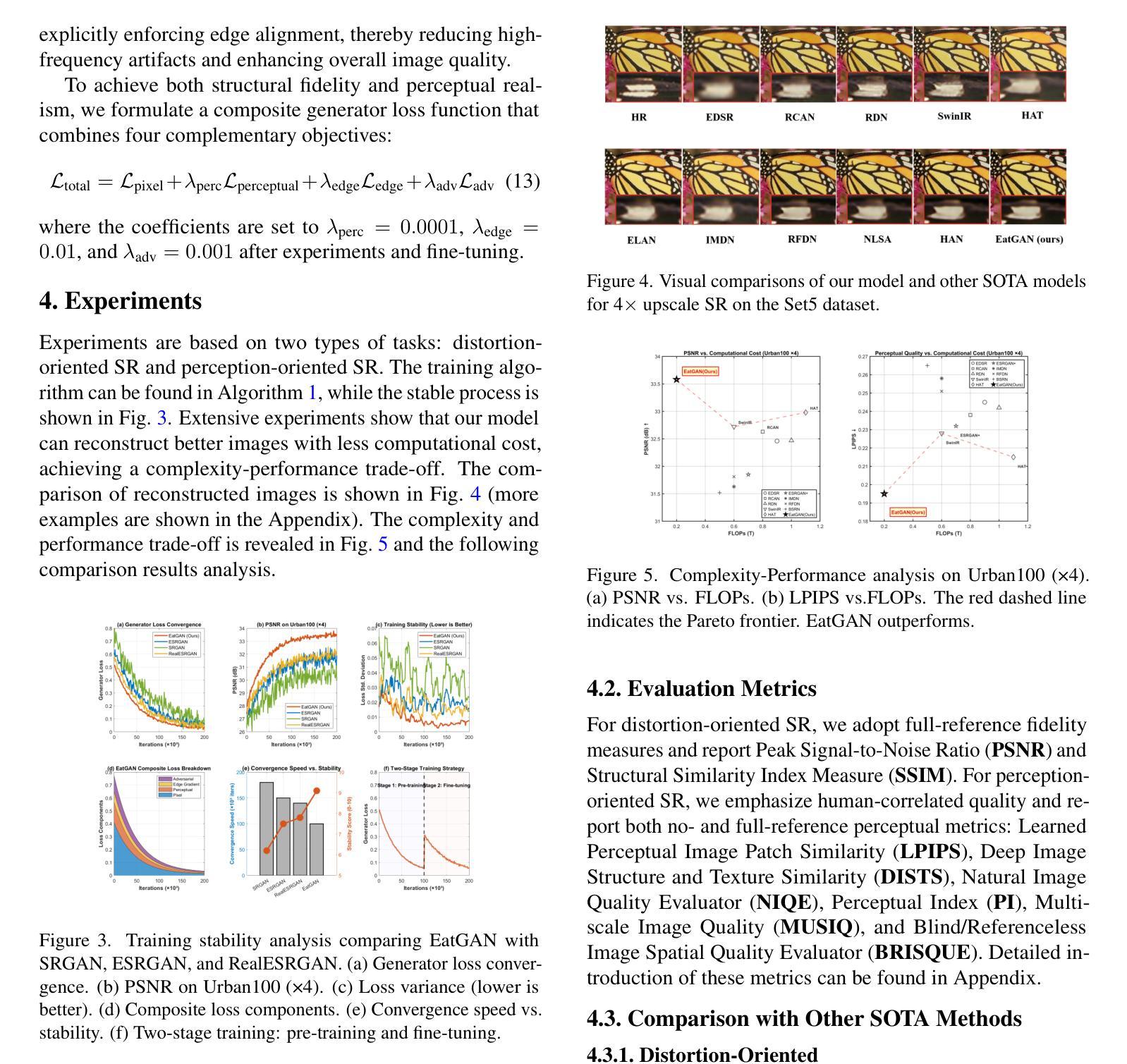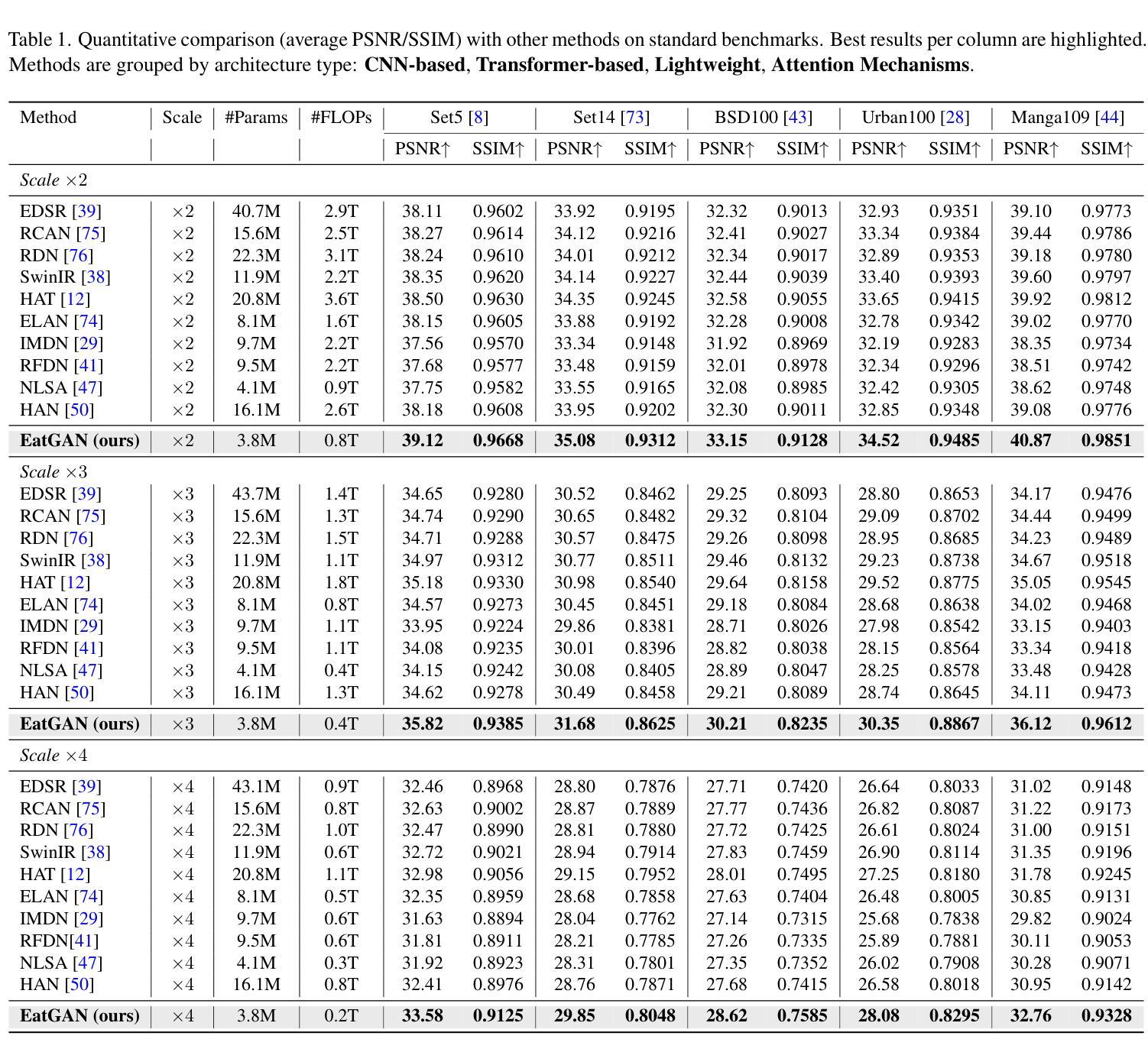 - 实验表明,EatGAN在面向失真的基准测试和面向感知的基准测试中均达到最新状态,特别是在Manga 109上的表现令人瞩目。