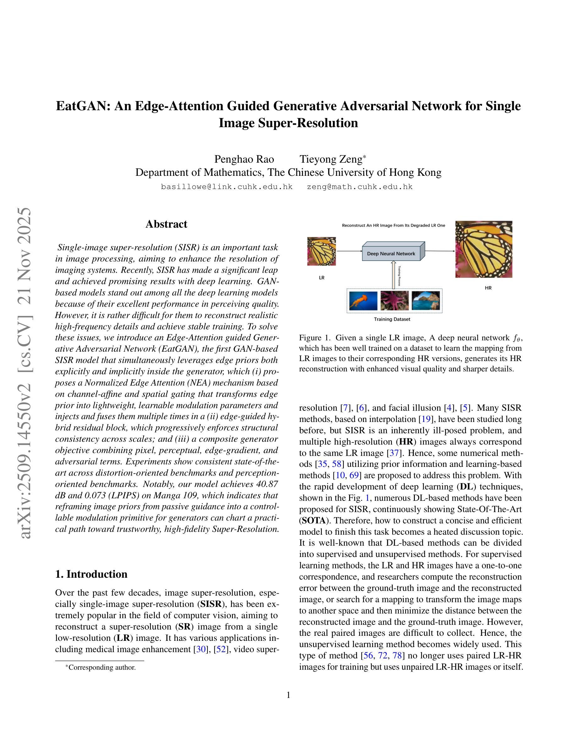 单图像超分辨率(SISR)是图像处理中的一项重要任务,旨在提高成像系统的分辨率。最近,SISR在深度学习领域取得了重大突破,并取得了有前景的结果。基于GAN的模型在所有深度学习模型中脱颖而出,因为它们在感知质量方面表现出卓越的性能。然而,它们很难重建逼真的高频细节,并且实现稳定的训练。为了解决这些问题,我们引入了Edge-Attention引导生成对抗网络(EatGAN),这是第一个基于GAN的SISR模型,该模型在生成器中同时显式利用边缘先验和隐式利用边缘先验。它(i)提出了一种基于通道仿射和空间门控的归一化边缘注意力(NEA)机制,该机制将边缘先验转换为轻量级、可学习的调制参数,并在(ii)边缘引导混合残差块中多次注入和融合这些参数,该块逐步强制执行跨尺度的结构一致性;(iii)复合生成器目标,结合像素、感知、边缘梯度和对抗性术语。实验表明,在面向失真的基准测试和面向感知的基准测试中,我们的模型均表现出卓越的性能。值得注意的是,我们的模型在Manga 109上实现了40.87 dB和0.073(LPIPS),这表明将图像先验从被动指导重新定义为可控的调制原始数据,可以为生成器开辟一条实现可靠、高保真超分辨率的实际路径。